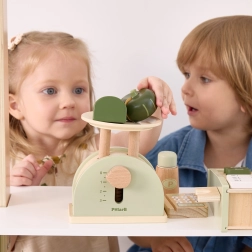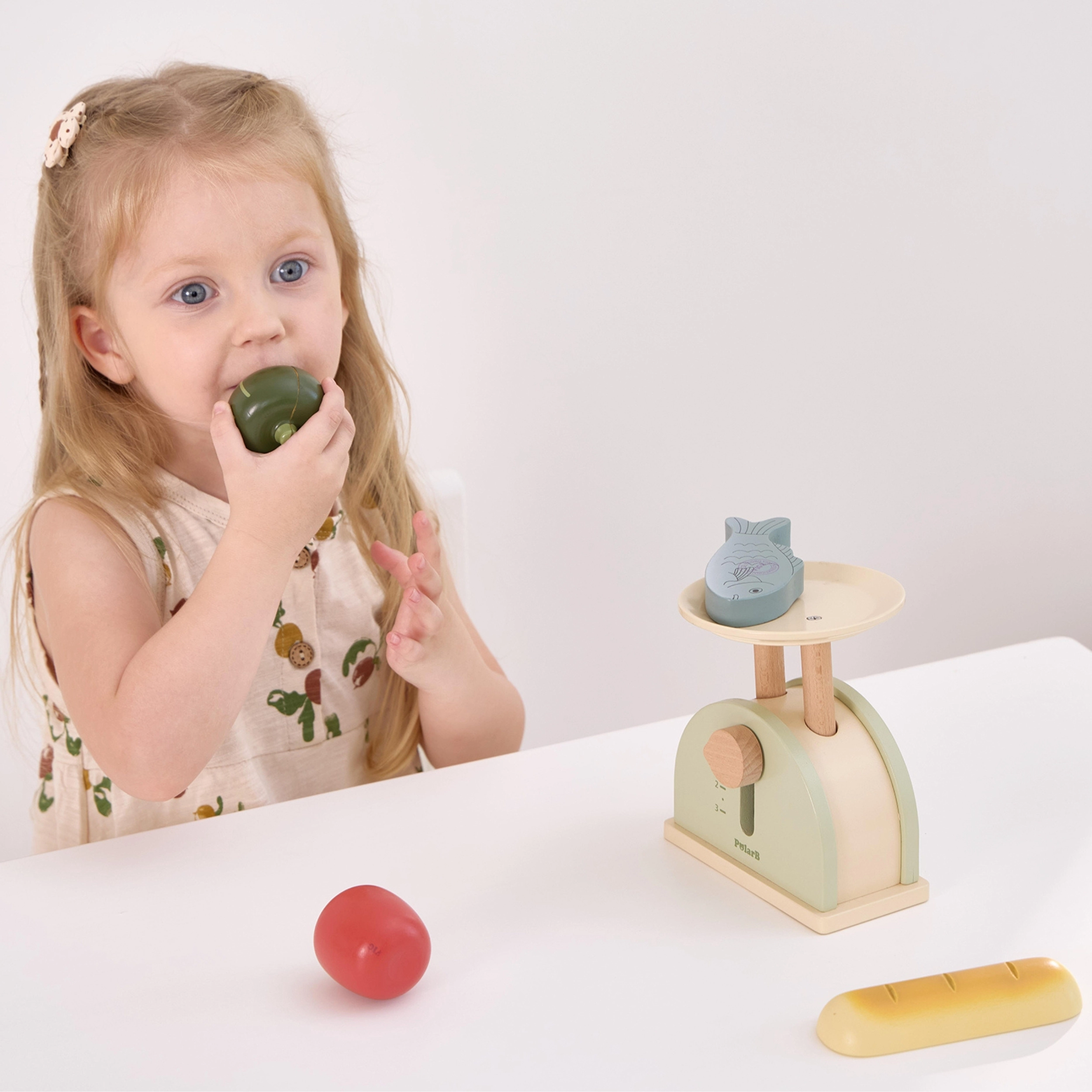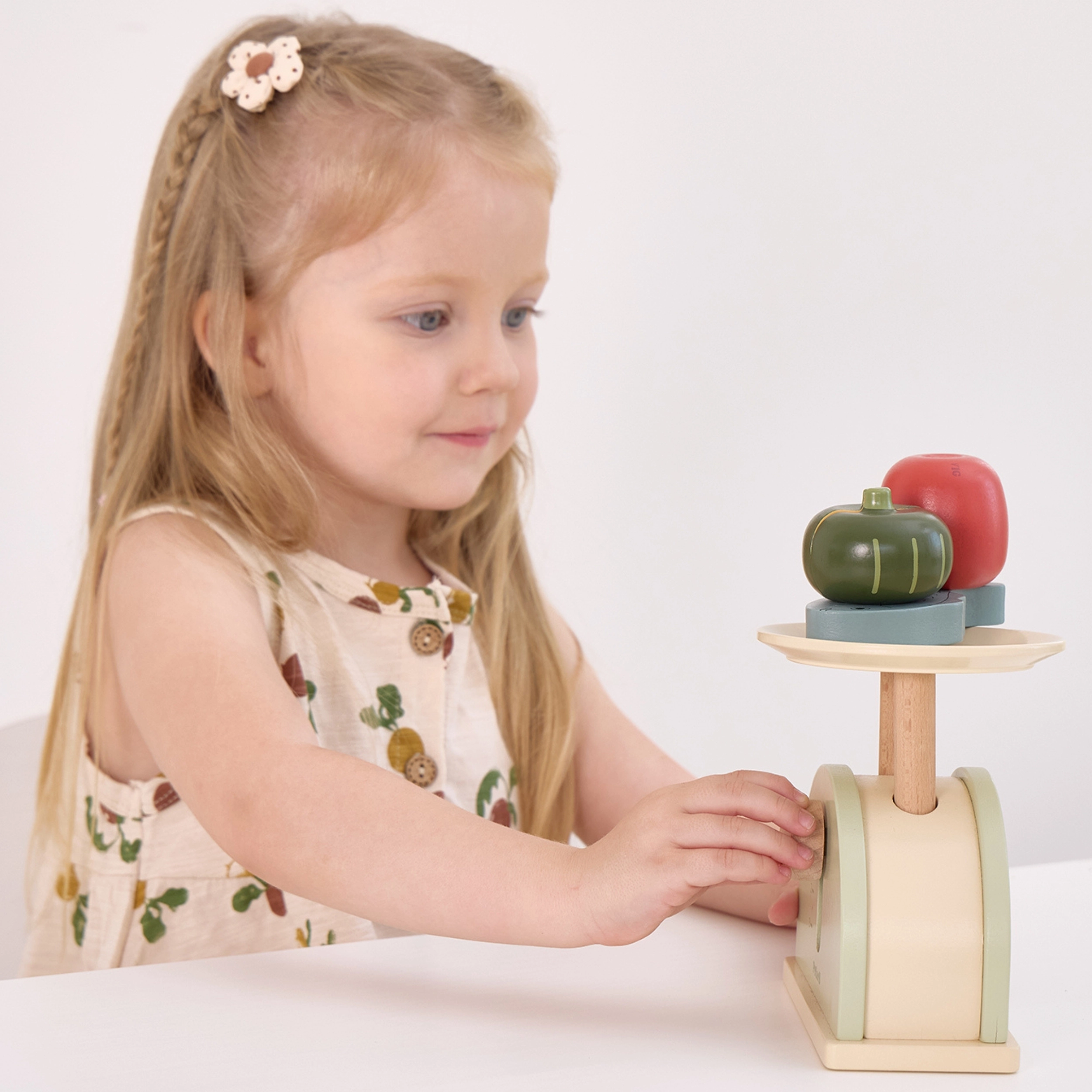Насърчава въображението и социалните умения. Децата могат да „мерят“ плодове и зеленчуци и да създават собствени истории и сценки.