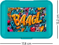 Кутия за сандвич с ярък графити мотив и логото на BAAGL, която носи уникален стил.