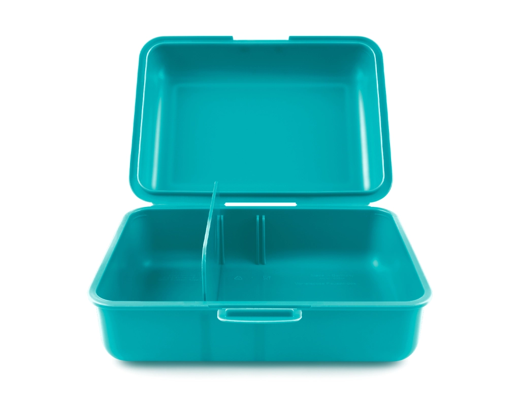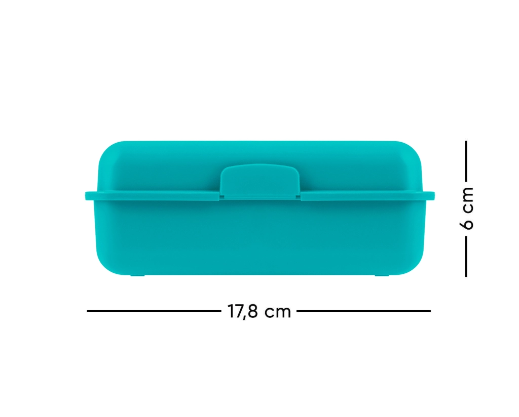 Тюркоазена пластмасова кутия с размери 17,8 cm x 12,2 cm, подходяща за пренасяне на храна.