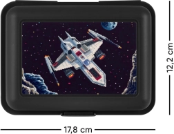Пластмасовата кутия има атрактивен дизайн с космически кораб и звезди, който ще впечатли всеки.
