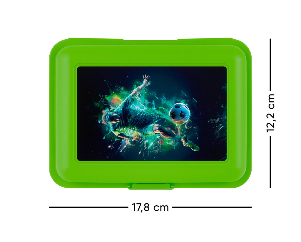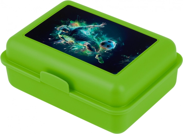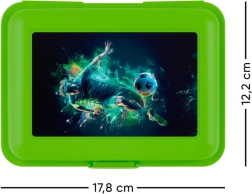 Насладете се на удобство и стил с тази пластмасова кутия за сандвич, украсена с динамичен футболен мотив. Проектирана е за максимална функционалност и естетика:
