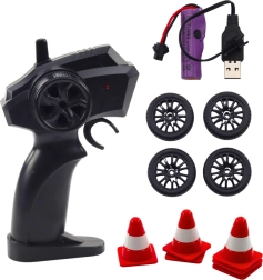 - RC кола (жълта), контролер 2.4 GHz, акумулатор с USB кабел, 4× дрифт колела, тренировъчни конуси