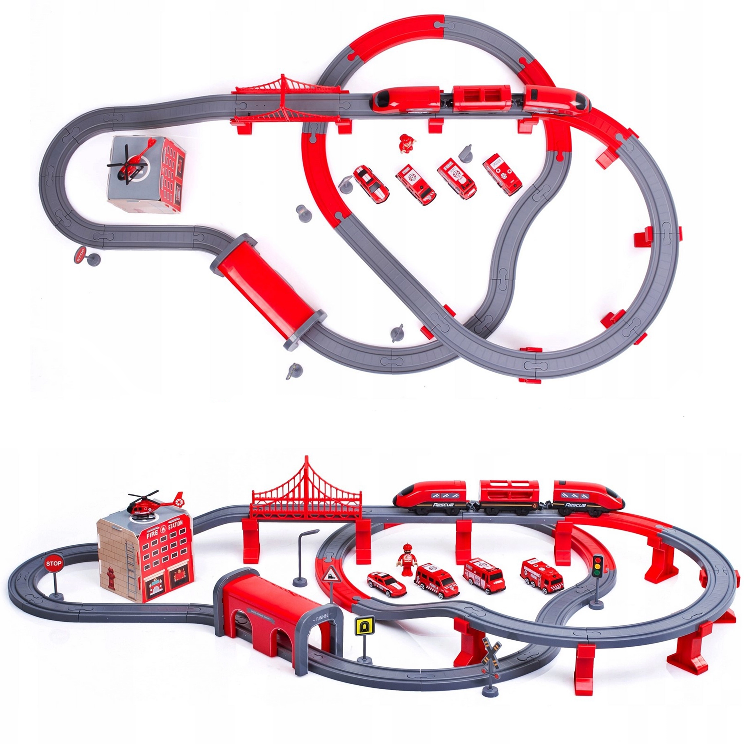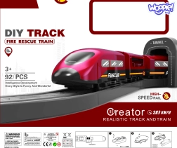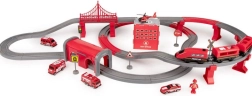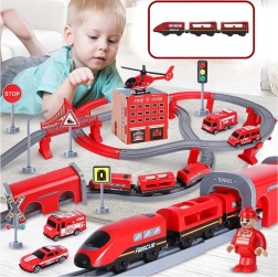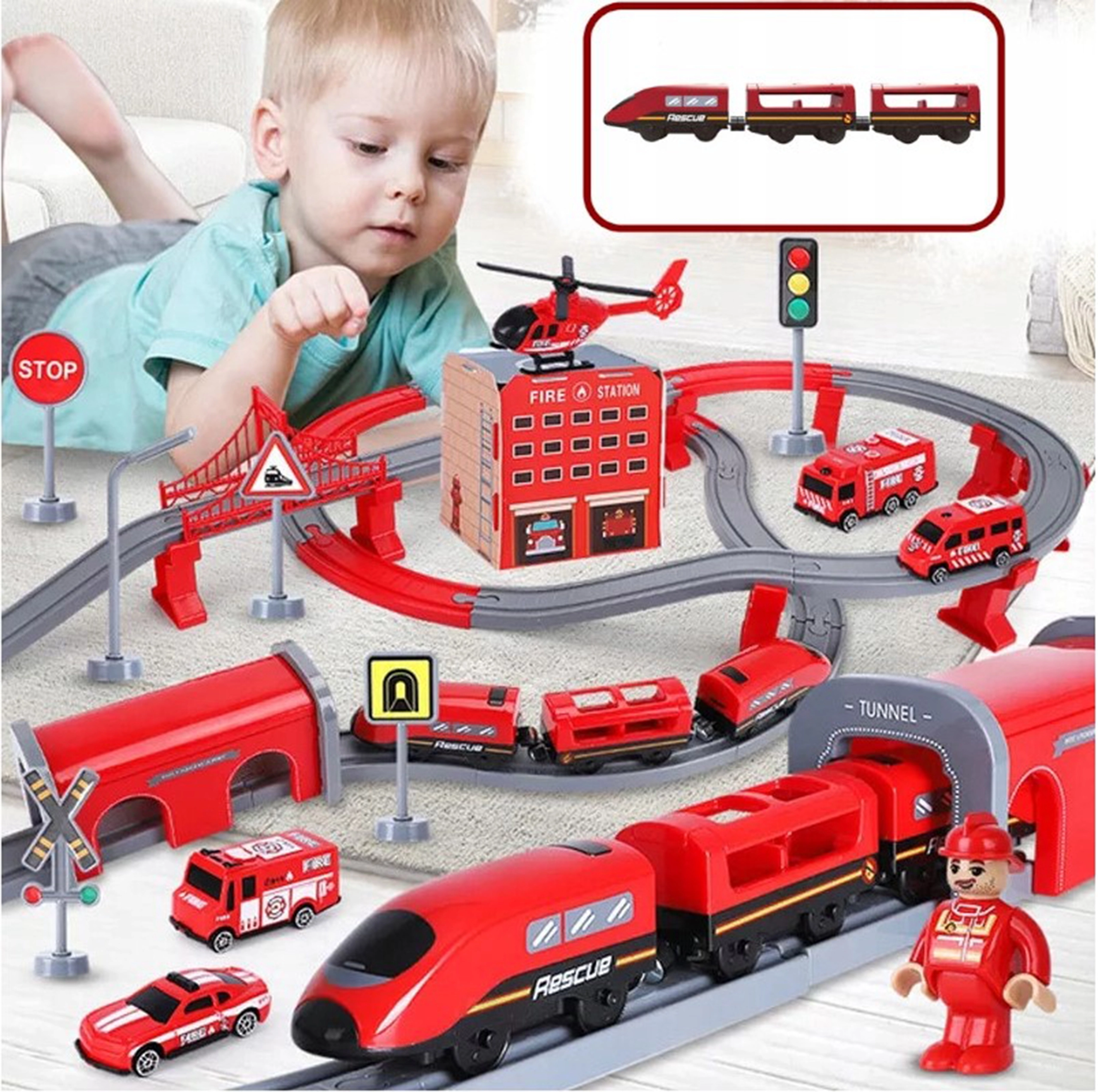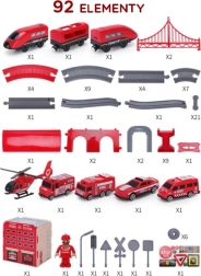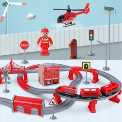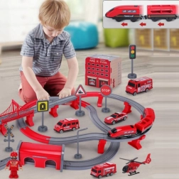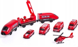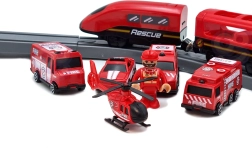 В комплекта са включени локомотив (2× AAA, не са включени), 2 вагона, 4 пожарни превозни средства, хеликоптер, фигурка на пожарникар, депо, мост, тунел, релси, подпори и пътни знаци. Комбинацията от железопътна и пътна спасителна техника подпомага координацията око–ръка, пространствената ориентация и сюжетната игра.