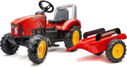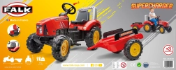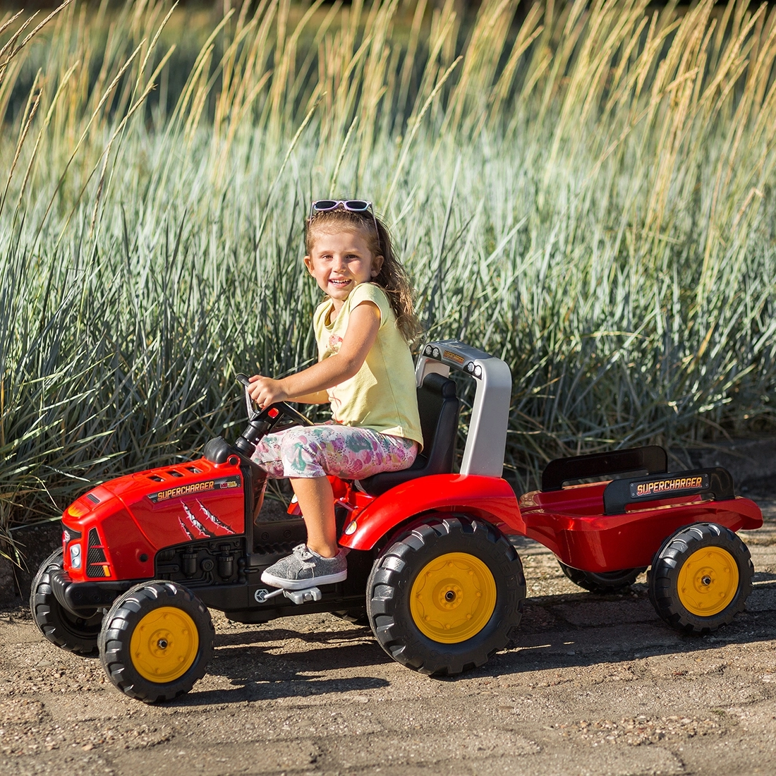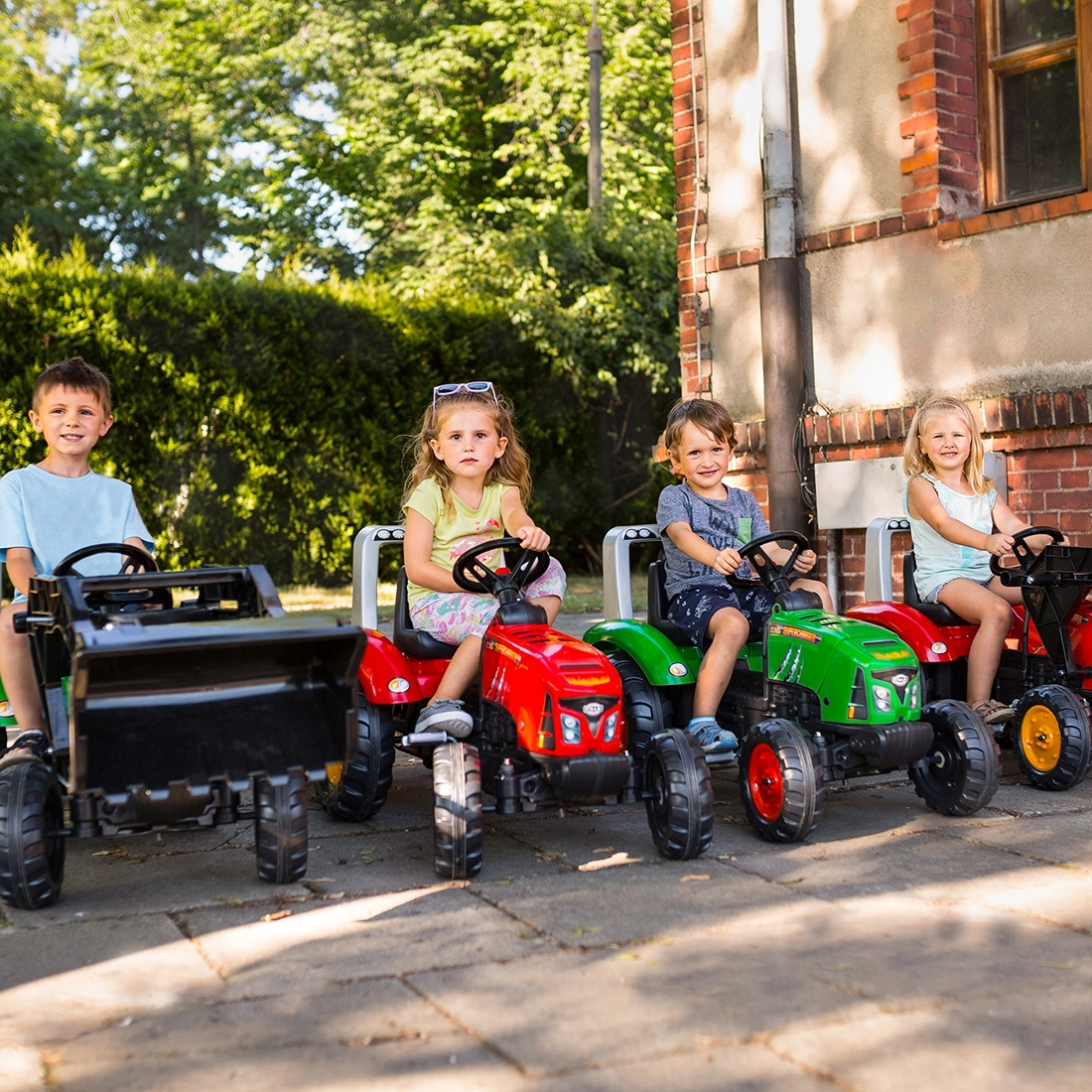 Благодарение на верижното задвижване на задния мост и стабилната конструкция тракторът се справя и с по-неравни повърхности. Подвижното ремарке е идеално за превоз на играчки или малки съкровища от градината. Продуктът е предназначен за частичен монтаж, който се извършва за кратко време.