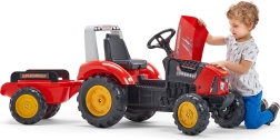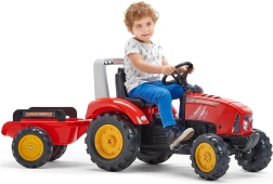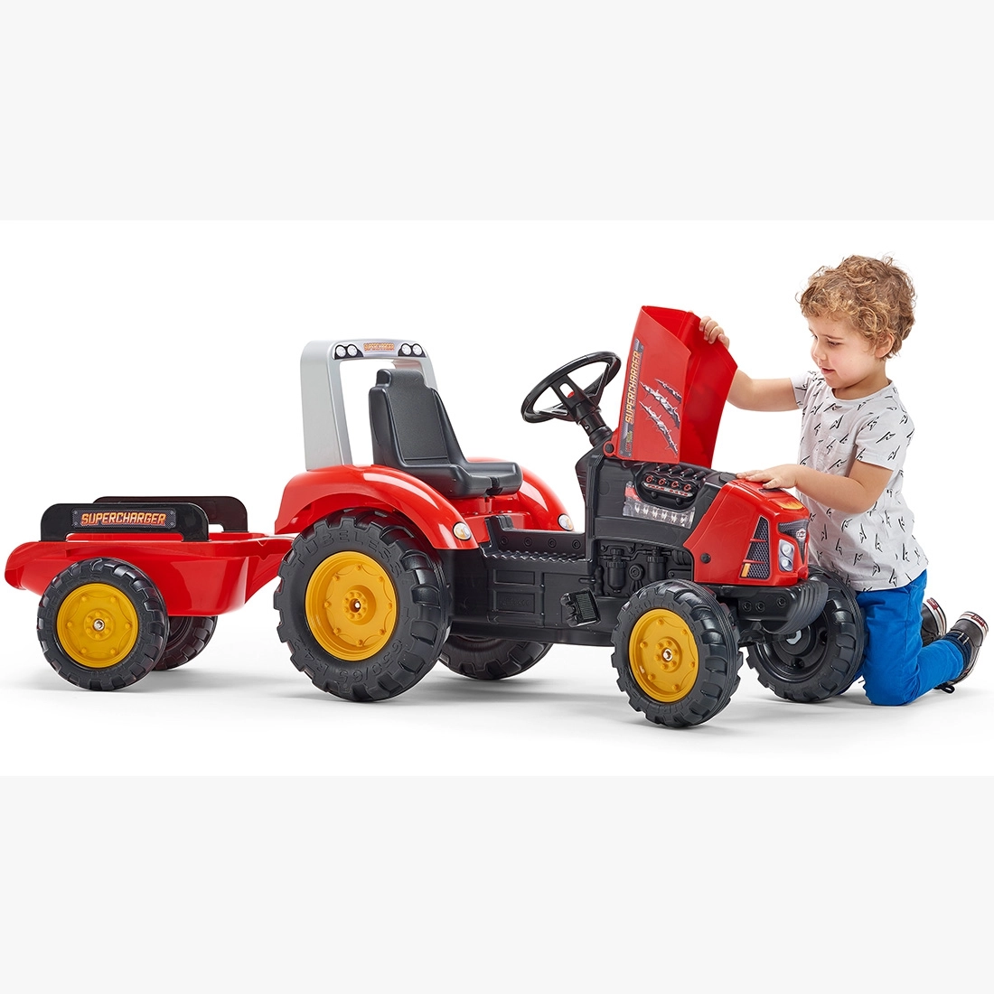 Тракторът е изработен от висококачествена пластмаса и е предназначен за деца от 3 години. Лесен е за управление, развива едрата моторика и стимулира въображението при фермерски игри. Отварящият се капак с имитация на двигател придава автентичност на играта, а клаксонът на волана повишава безопасността и забавлението.