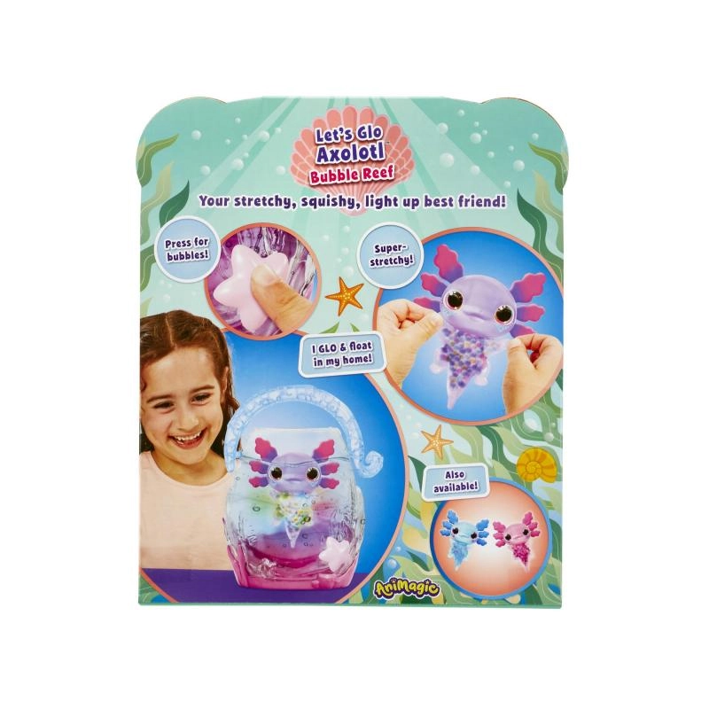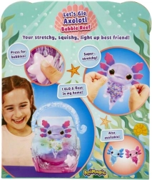 Открий магията на подводния свят с този сладък аксолотъл, който при потапяне във вода започва да свети! Мекото и еластично тяло е приятно за стискане, а преносимото „аквариумче“ с дръжка насърчава креативна игра с балончета у дома и в движение.
