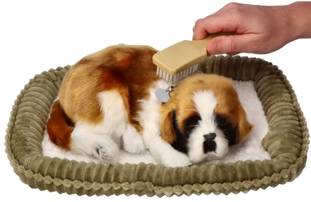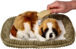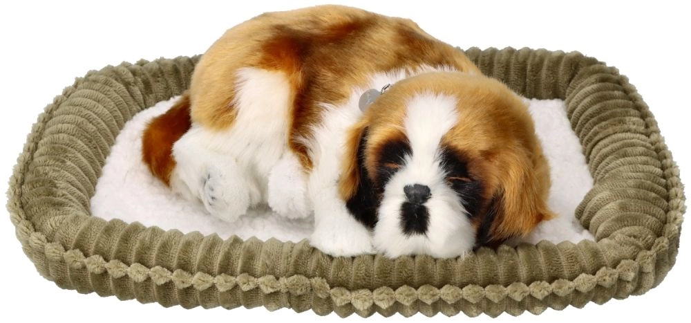 Кученцето правдоподобно имитира сън с повдигащо се коремче, така че изглежда като истинско куче. Идеално за успокояване и уютна атмосфера у дома.