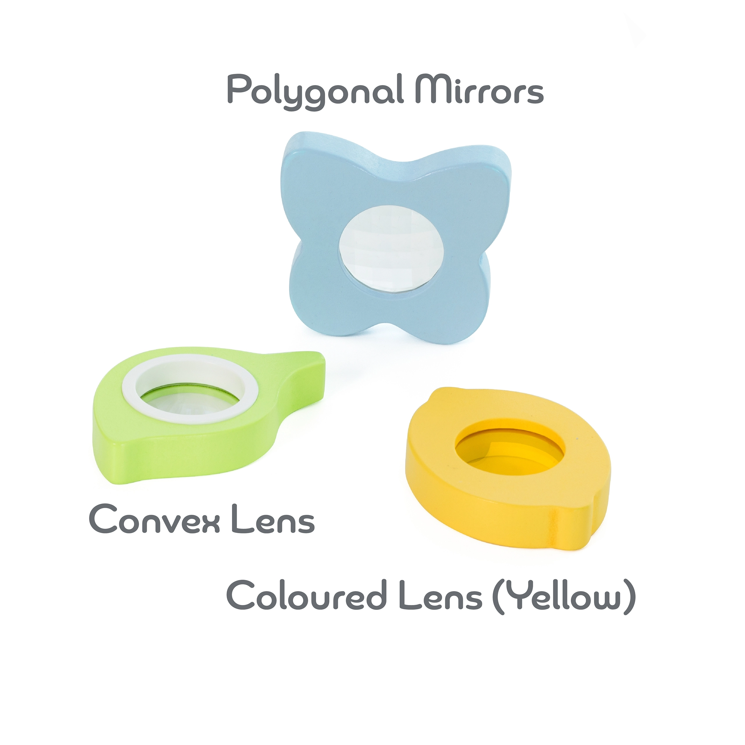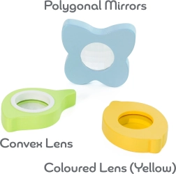 - Включва калейдоскоп и 3 различно модифицирани лещи, които променят цвета, формата и размера на заобикалящия свят