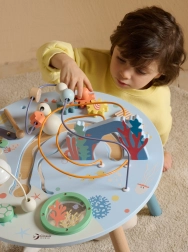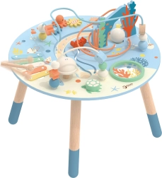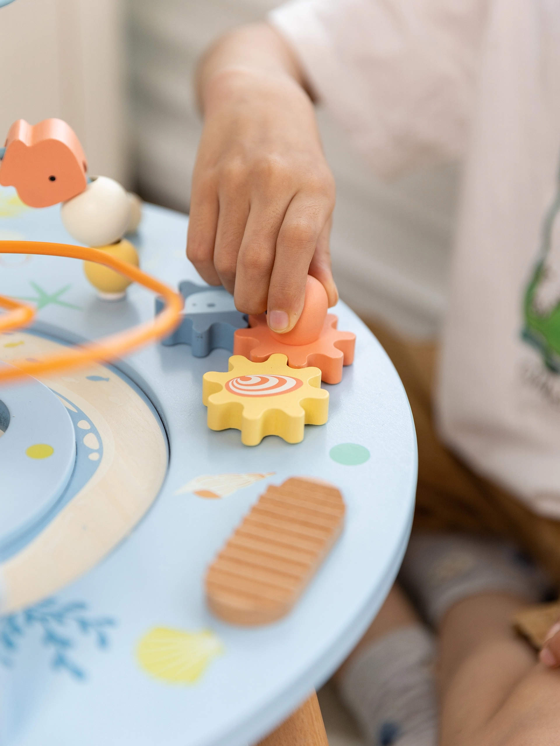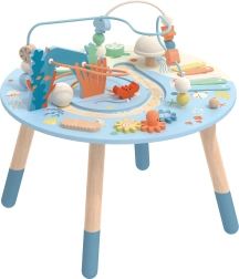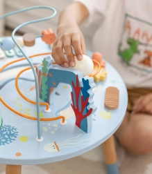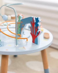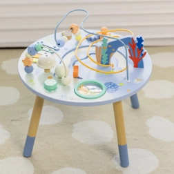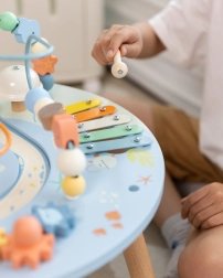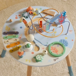 Дървената масичка с активности Морски живот е чудесно въведение в света на формите и цветовете. Безопасна за най-малките, изработена от качествено дърво и боядисана с нетоксични бои. Децата са насърчени да играят прави, което подпомага координацията и баланса им. Образователните ползи от тази масичка са значителни – от подобряване на фината моторика до развиване на музикални умения.