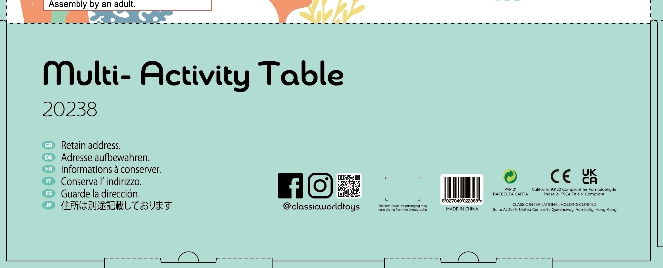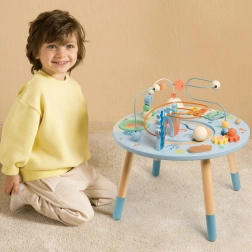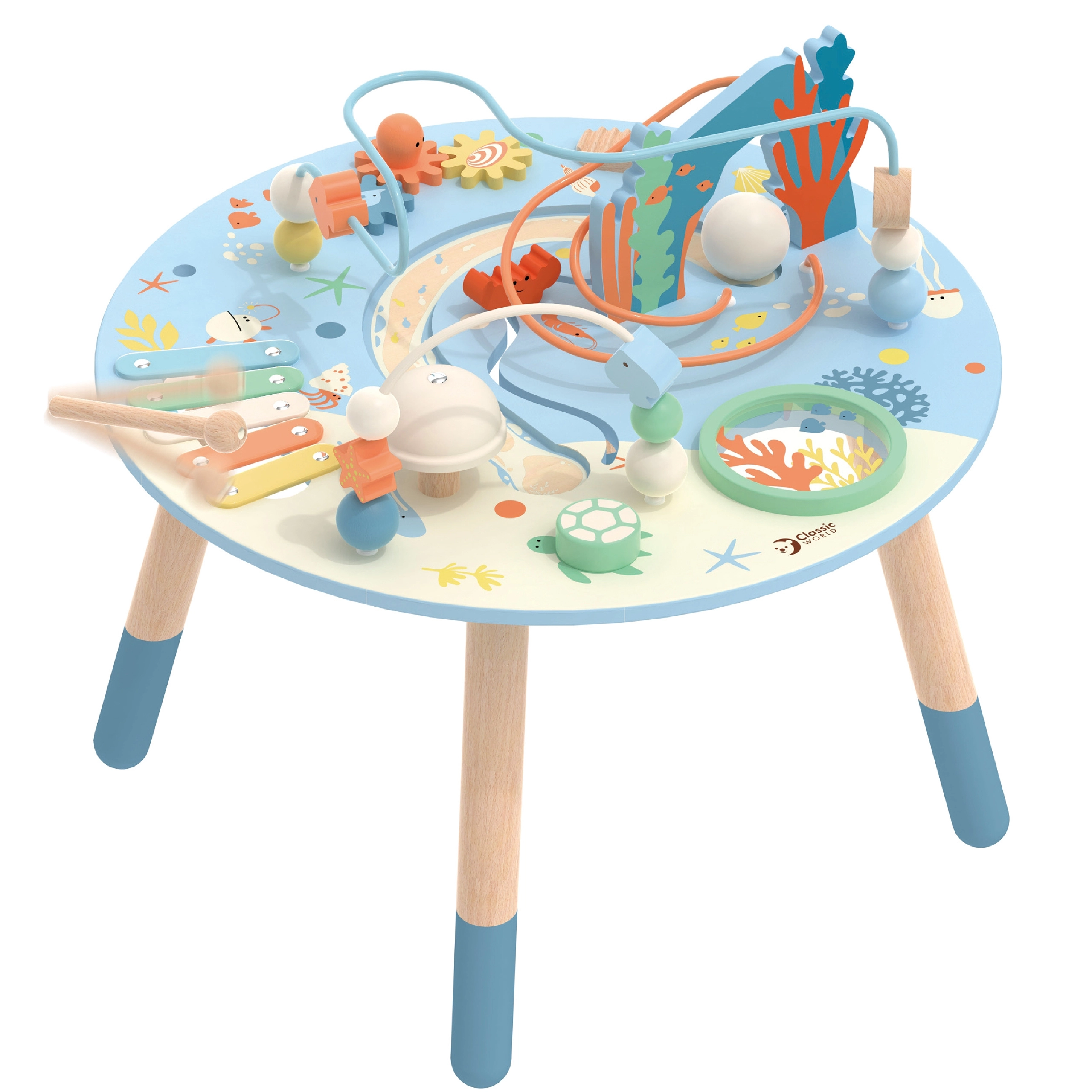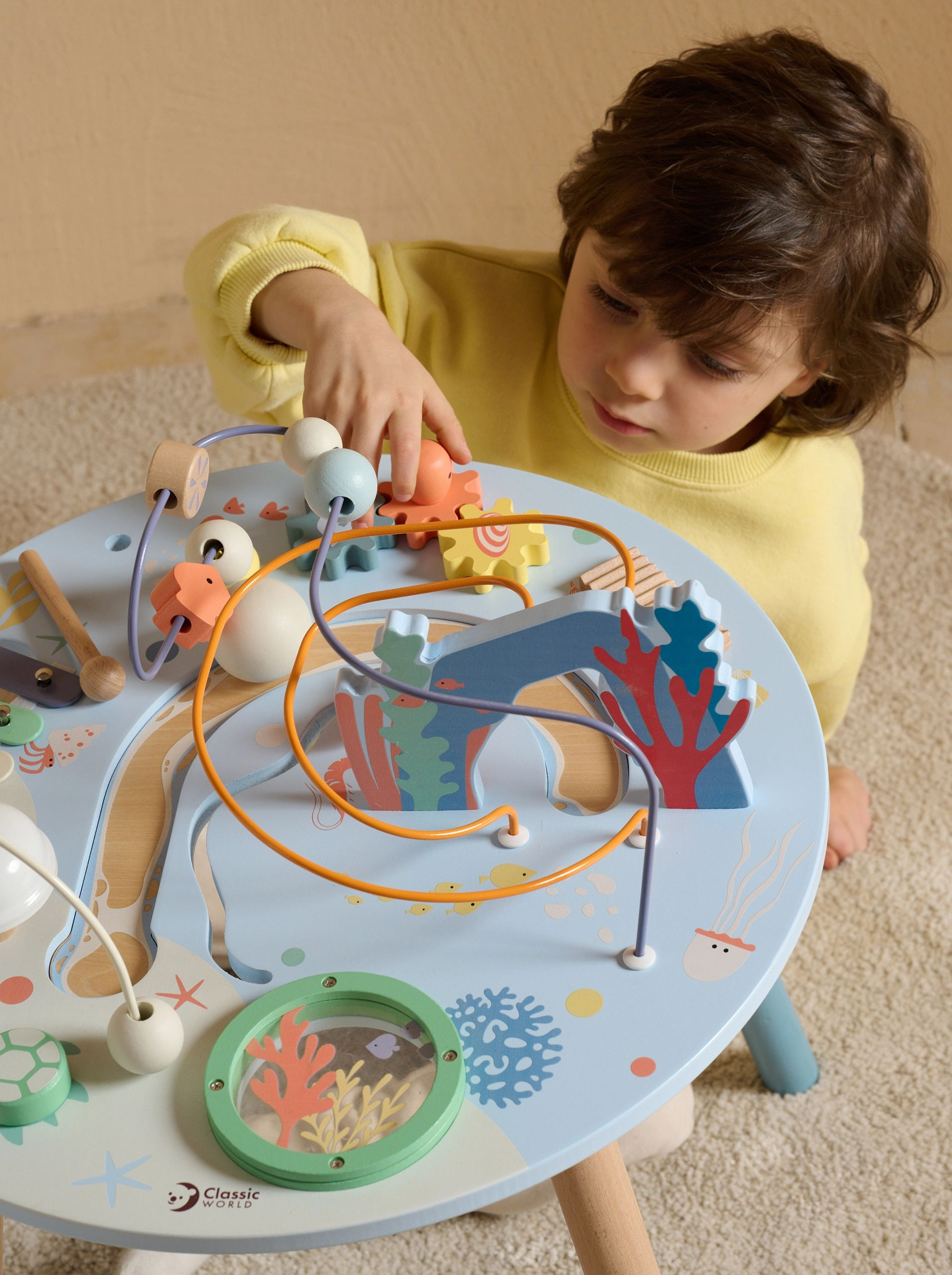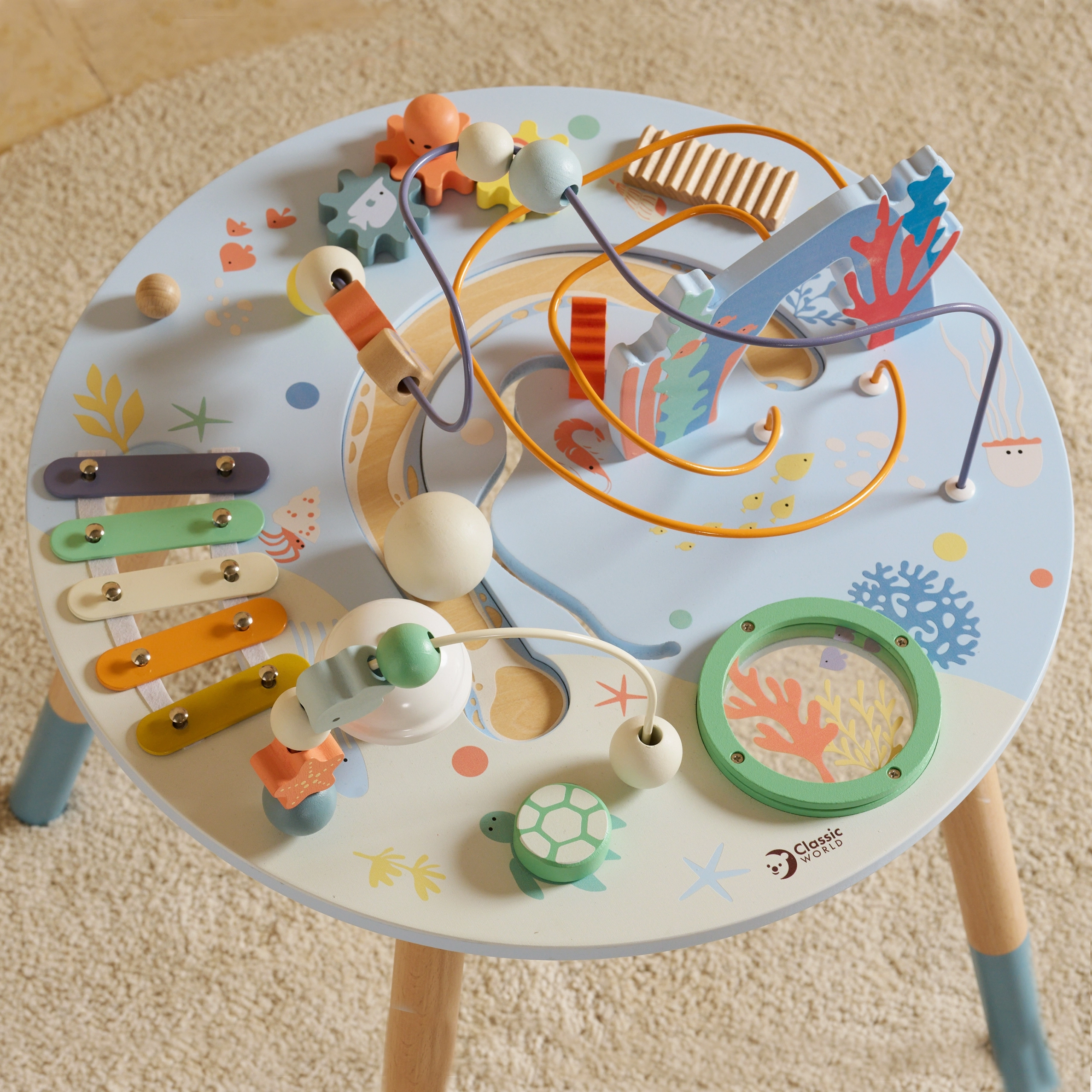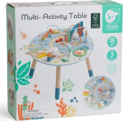 Дървената масичка с активности от марката Classic World е идеалната играчка за любопитни деца! Пълна с цветни атракции като три моторни лабиринта, зъбни колела, ксилофон и барабанче, тя носи много радост и едновременно помага за развиване на важни умения като сръчност, логическо мислене и ловкост.