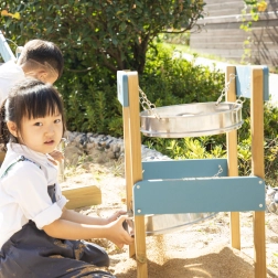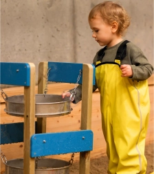 Двойното сито CLASSIC WORLD EDU е обмислена станция за сетивна (sensory) игра, която насърчава ученето чрез експерименти. Двете метални сита с голяма площ са окачени на верижки, така че децата могат да наблюдават процеса на пресяване, да сравняват материали и да пробват различни скорости на изсипване или поливане с вода. Благодарение на здравата дървена конструкция комплектът е подходящ за ежедневна употреба в детски градини и на обществени площадки.