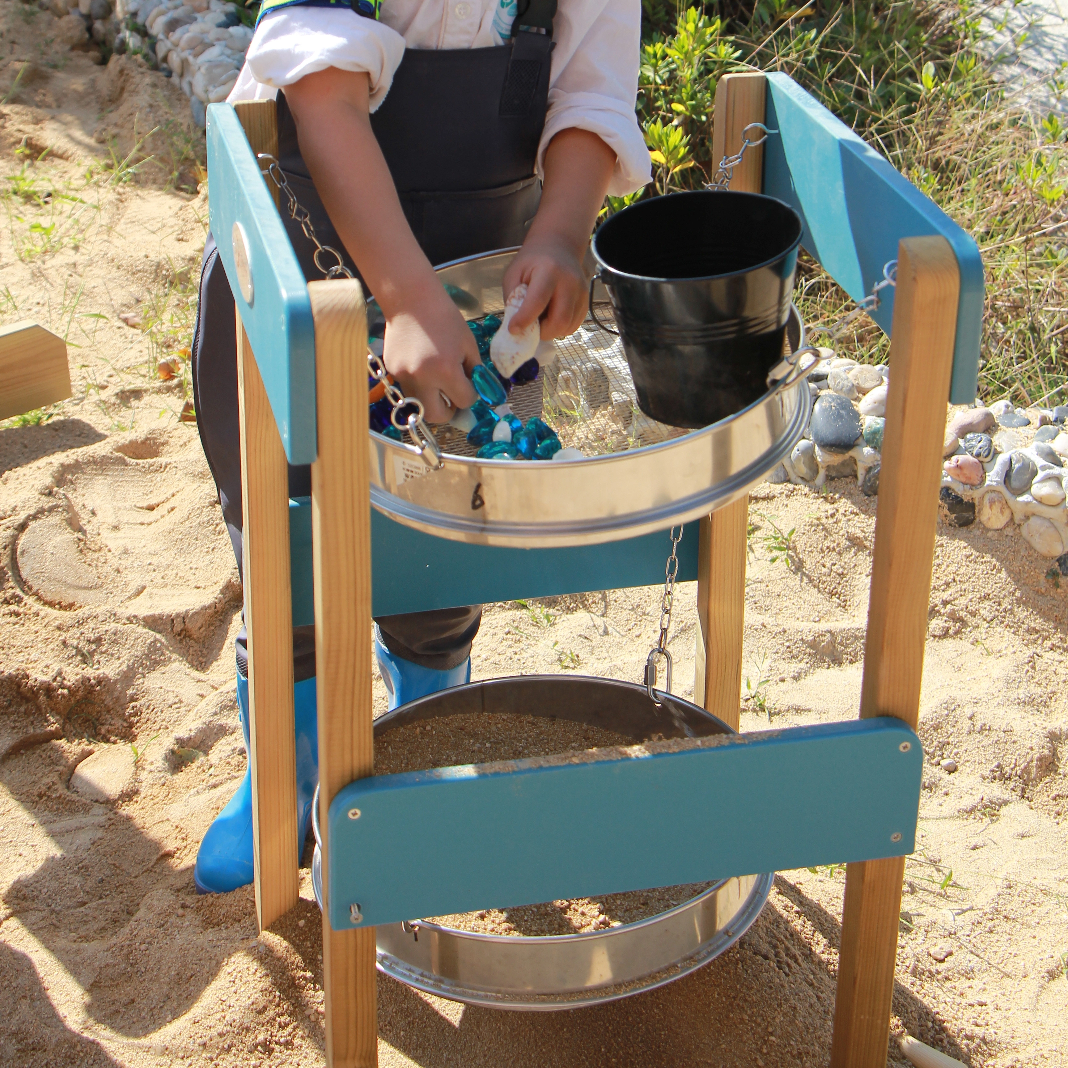 Двете окачени метални сита позволяват на децата да сравняват материали, да наблюдават процеса на пресяване и да разбират причинно-следствените връзки по забавен начин.