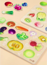 Открийте забавни дървени пъзели със зеленчуци, които насърчават учене чрез игра. Благодарение на 11-те цветни елемента децата тренират разпознаване на форми и цветове, подобряват координационните умения и развиват логическо мислене. Качественото дърво и привлекателните илюстрации гарантират безопасно и дълготрайно забавление.