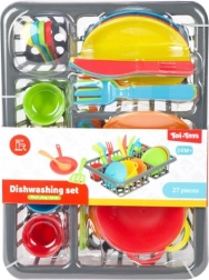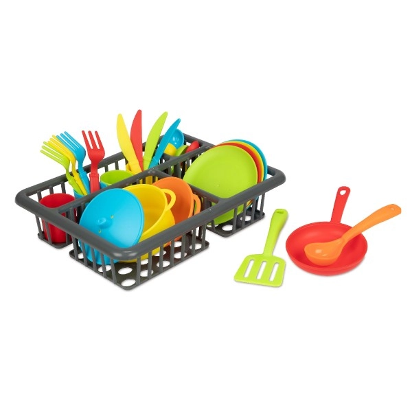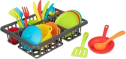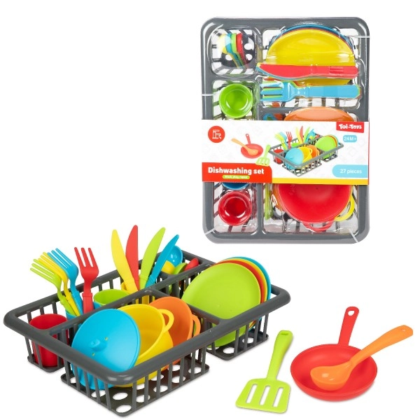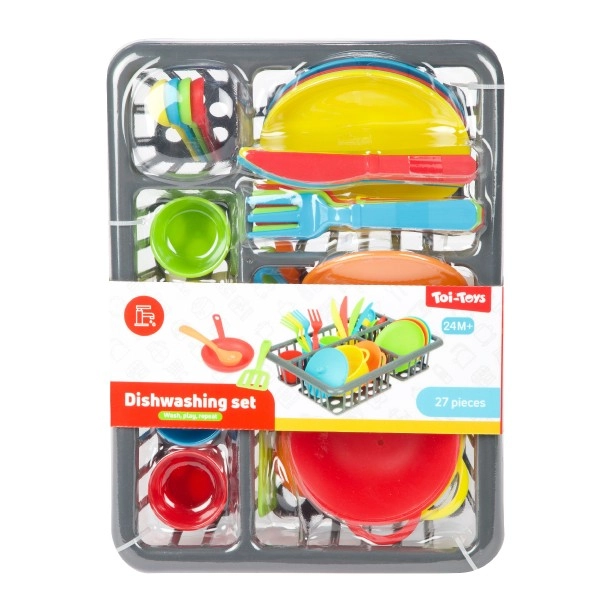 Забавен кухненски комплект за малки готвачи, който съдържа 27 части – тенджера, тиган, чинии, чашки, прибори и други аксесоари. Подпомага креативността, фината моторика и социалните умения при игра на готвене и сервиране. Практичната блистерна опаковка държи всичко подредено на едно място. Подходящо за деца от 2 години.