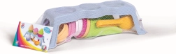 Практичната опаковка в мрежичка се пренася и съхранява лесно. Благодарение на стойката децата имат всичко под ръка и могат да си играят на малка сладкарница. Комплектът е подходящ от 10 месеца и благодарение на заоблените форми приляга отлично в детските ръце.