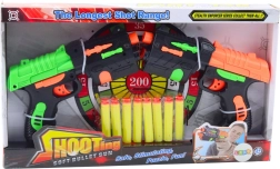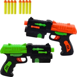 Открийте двойна доза забавление с комплекта от два пистолета за пяни стрелички с вендузи. Ергономични дръжки, компактни размери и прост ръчен механизъм гарантират удобно и безопасно използване. Цветният, динамичен дизайн ще впечатли по-малки и по-големи стрелци и ще подпомогне техните двигателни умения.