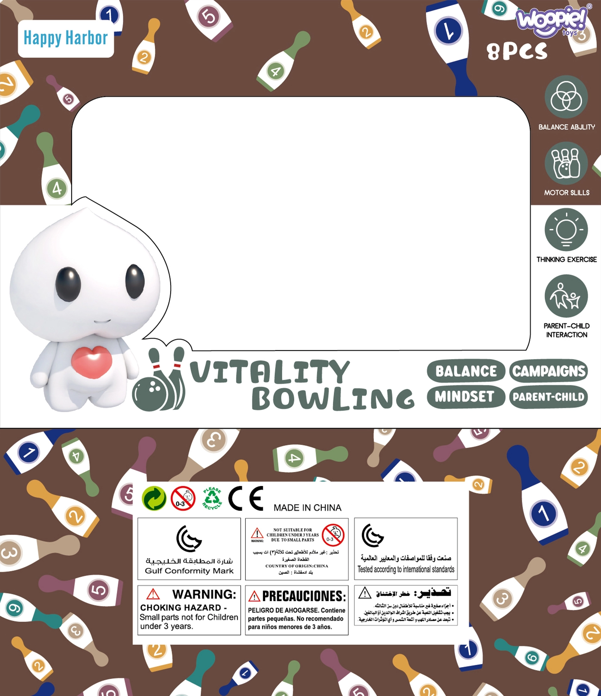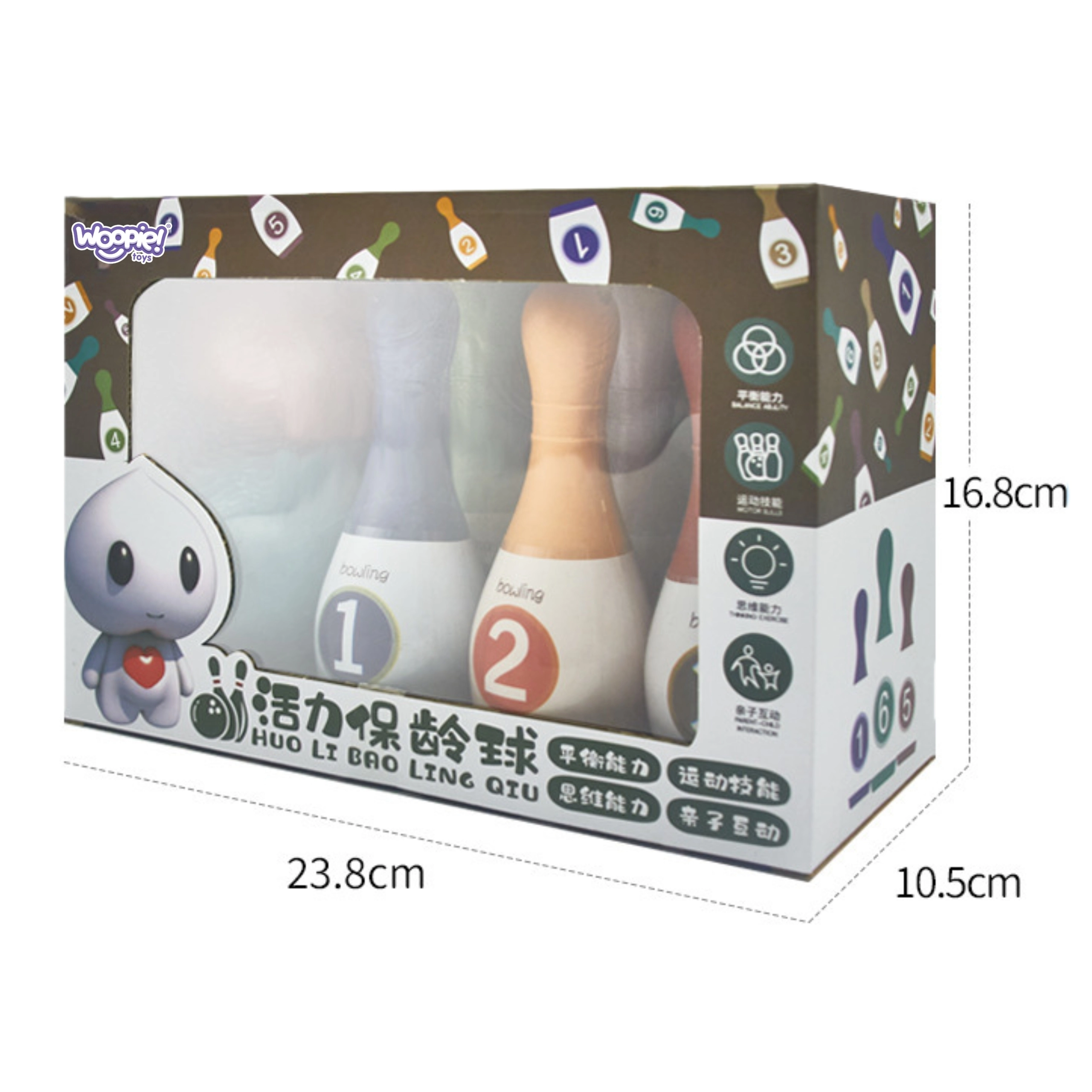 Организирайте домашен турнир по боулинг с пълния комплект WOOPIE! Този забавен сет е идеален за деца от 3 години и за цялото семейство. Насладете се на играта навсякъде – у дома, на терасата или в градината. Забавление, което подпомага координацията на движенията, прецизността и здравословната състезателност, е готово за миг благодарение на компактните размери и лесното сглобяване.