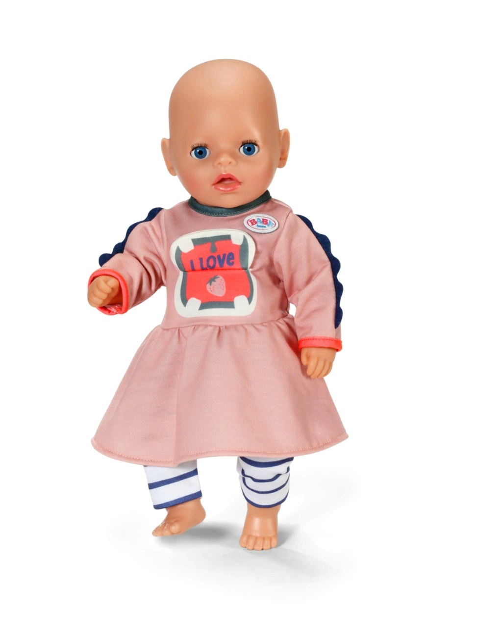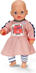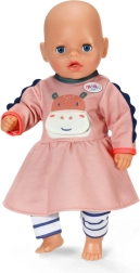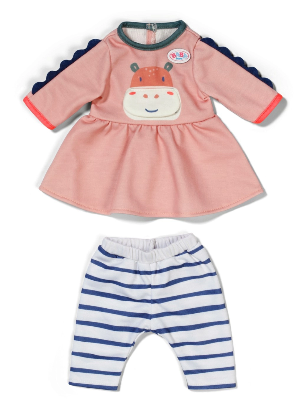 Подарете на куклата си стилен тоалет, който впечатлява от пръв поглед. Рокличката в нежни цветове с мило хипопотамче и удобните раирани клинчета са идеални за ежедневна игра и специални истории. Благодарение на качествените тъкани дрешката запазва добре формата си и се облича лесно.