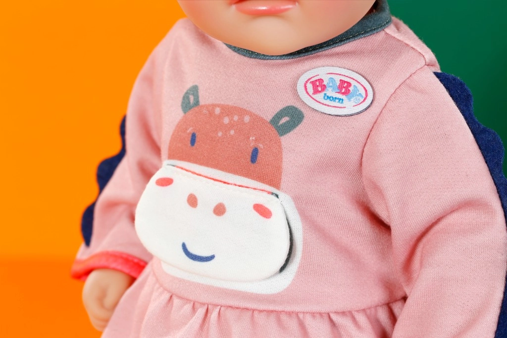 Интерактивният детайл под формата на отваряща се уста на хипопотамчето добавя елемент на изненада и развива въображението. Комплектът е проектиран за кукли 36 cm и е допълнен с практична закачалка от рециклиран материал, която помага гардеробът на куклата да остане добре подреден.