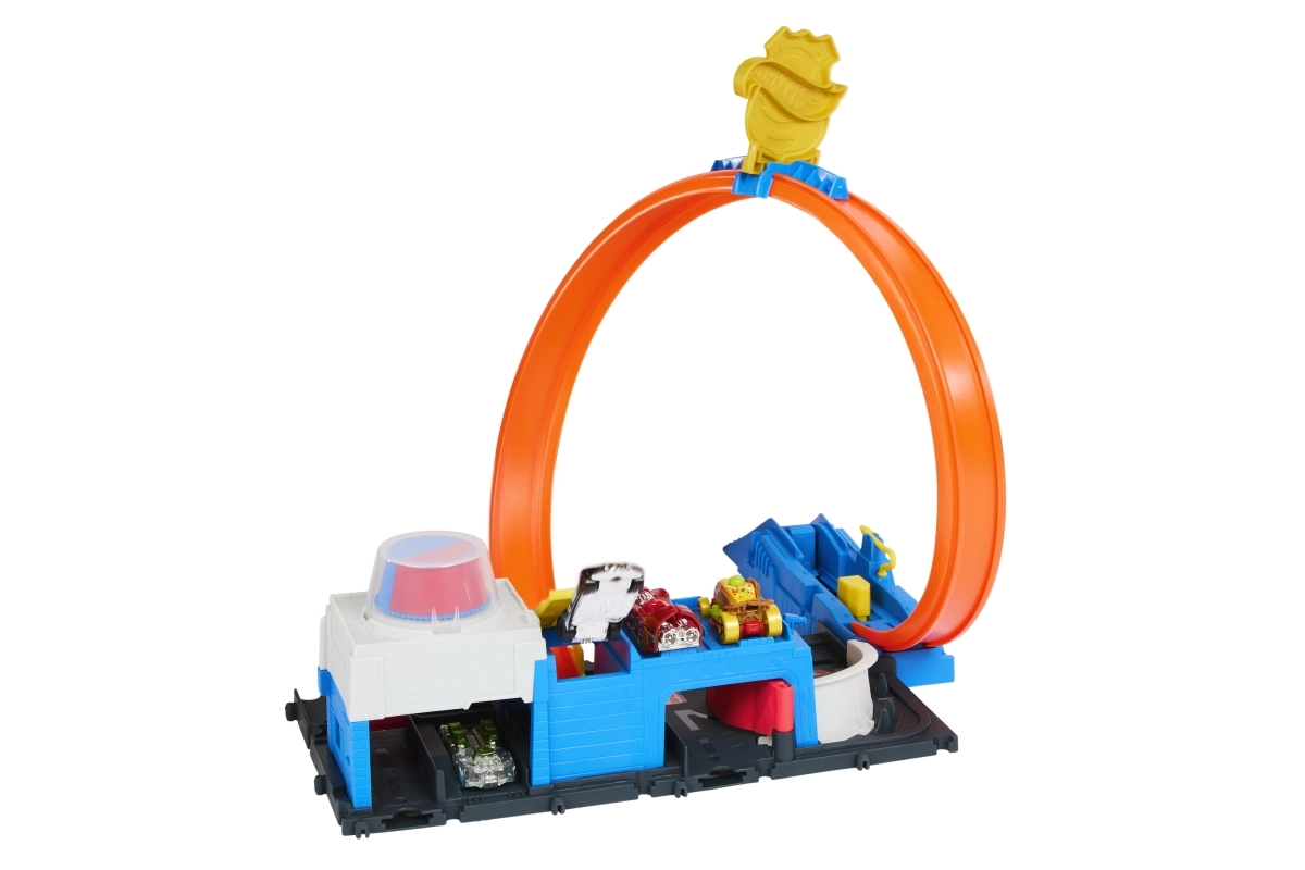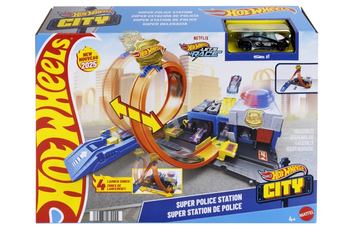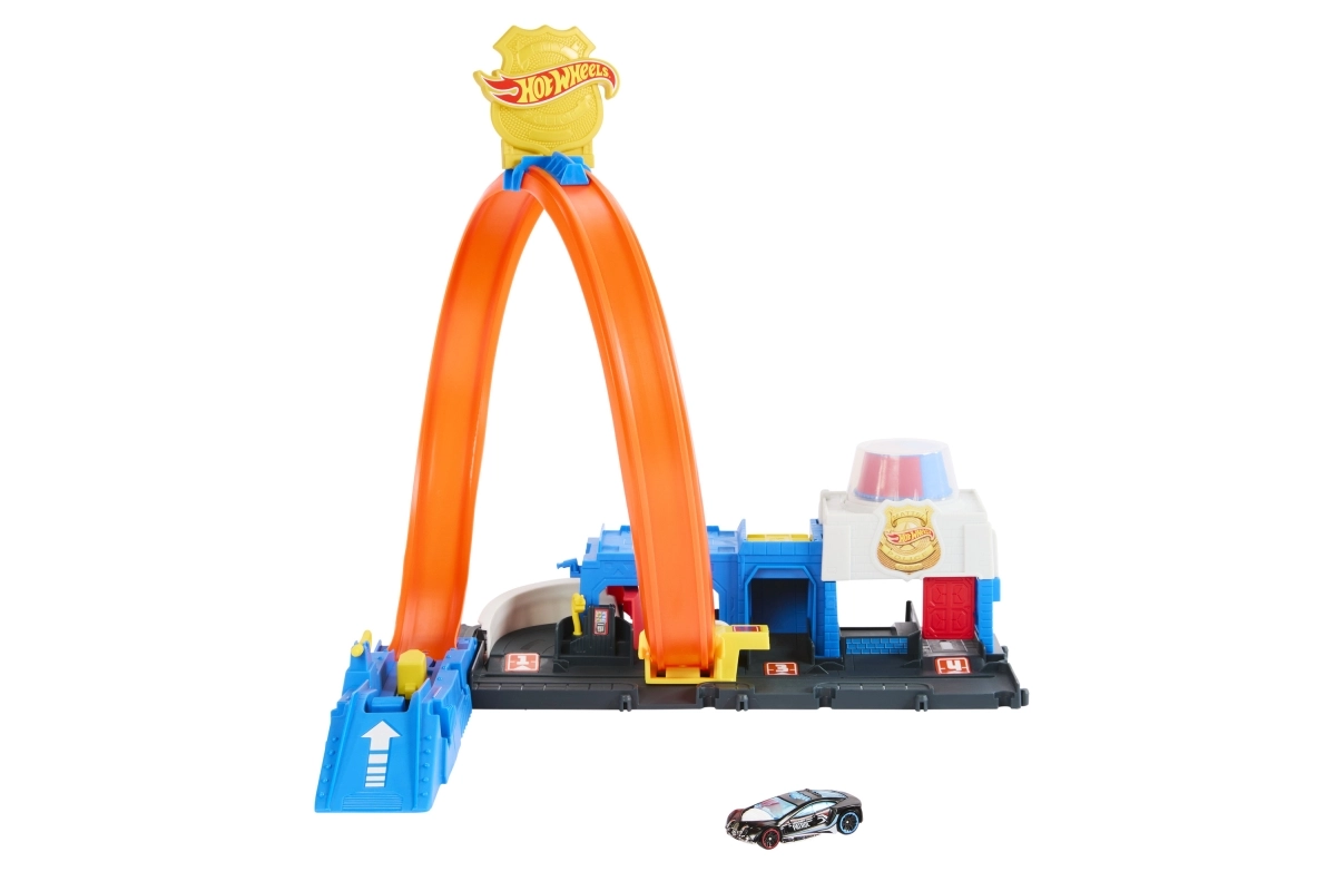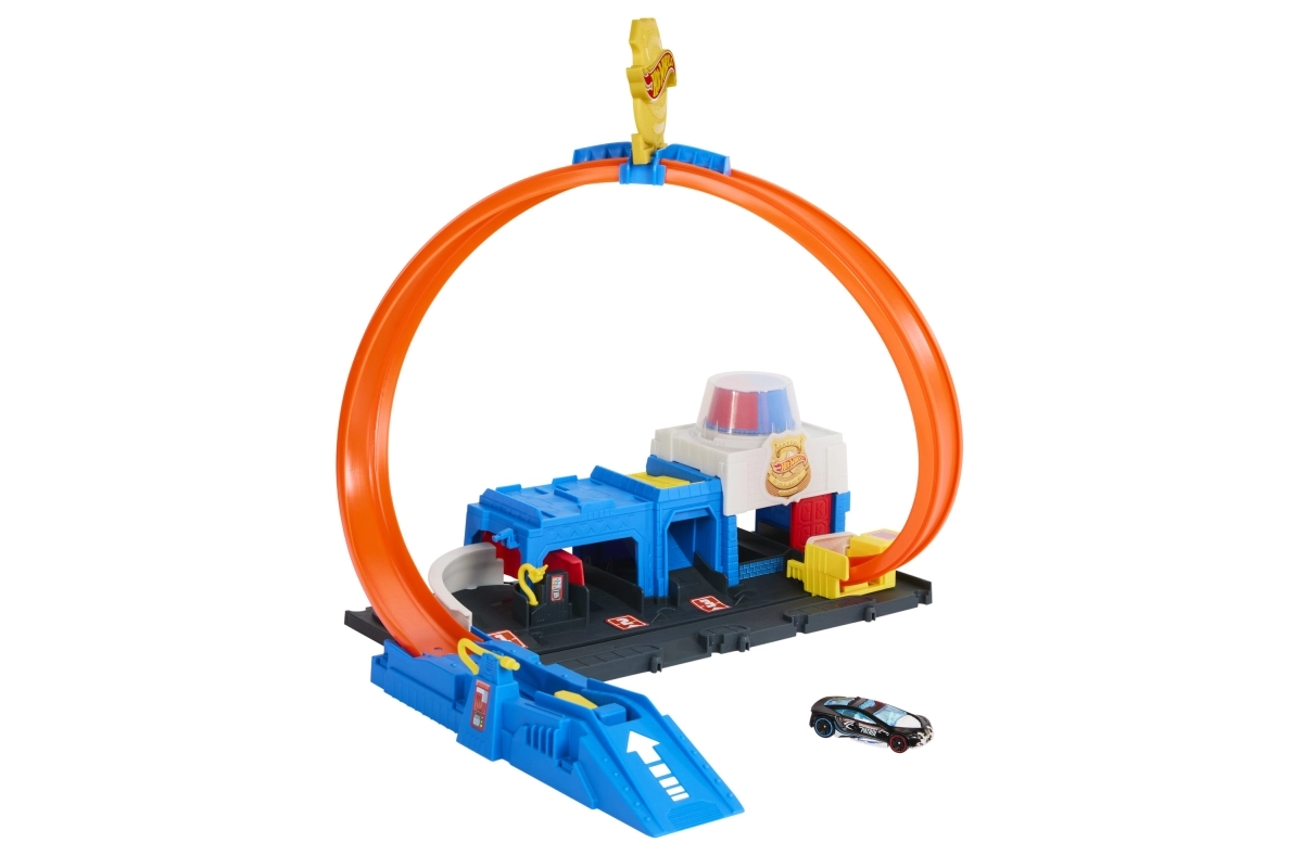 В комплекта има компактна база в стил полицейска станция, стартер за мощен старт и емблематична примка, която ще изпита всяка количка. Сетът може лесно да се свързва с други писти HOT WHEELS и така да разширите града с нови предизвикателства, рампи и препятствия.