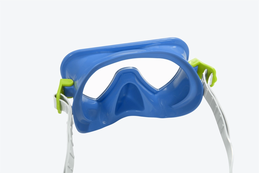 Синята маска за гмуркане е оборудвана с лещи с UV защита и регулируема силиконова каишка, която осигурява комфорт и безопасност под водата.