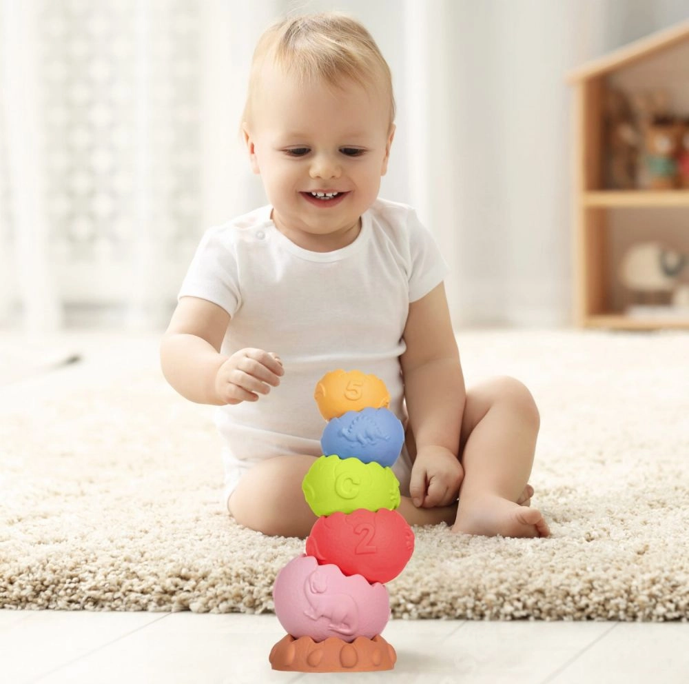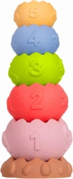 Пастеловите елементи се хващат лесно и се подреждат стабилно във висока кула. Децата тренират координацията око–ръка и търпението при всяко изграждане на пирамидата.