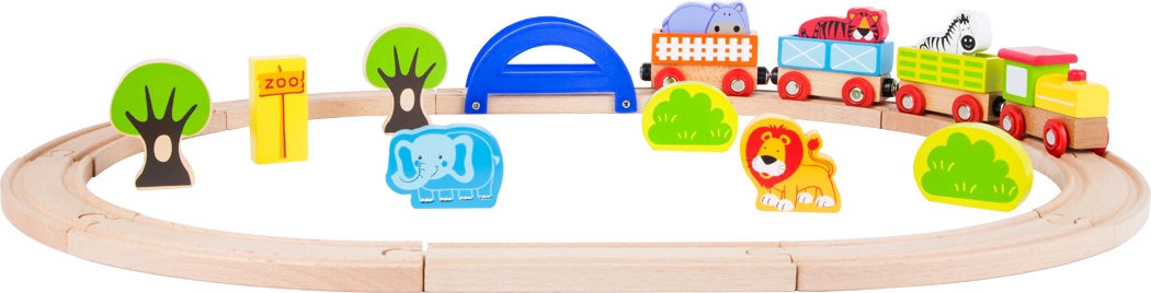 Това дървено влакче „Моят зоопарк“ предлага на децата пъстър игрови свят с 24 части. Благодарение на магнитните съединения вагончетата се прикачват и откачват лесно, а интерактивните елементи като мост, дървета и фигурки на животни насърчават творческата игра и разказването на истории. Комплектът е идеален за самостоятелна игра и за забавление с приятели.
