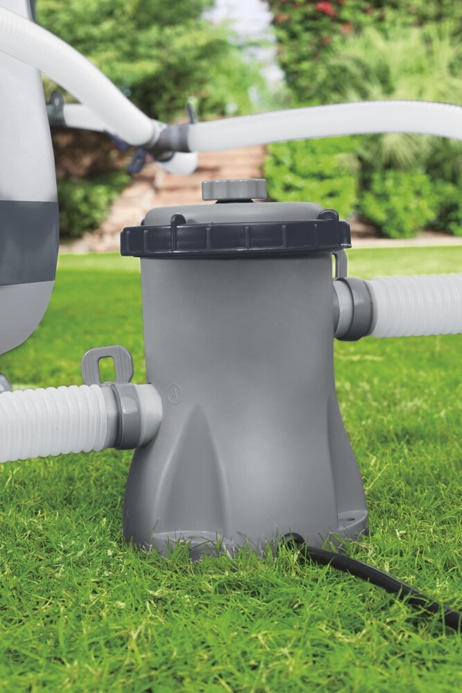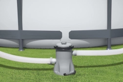Филтърната помпа BESTWAY Flowclear 1249 l/h е практично решение за чиста и хигиенична вода през целия къпален сезон. Двата приложени маркучни кръга осигуряват засмукване и връщане на водата през сменяем патронен филтър (тип I), който надеждно отстранява дребните замърсявания.