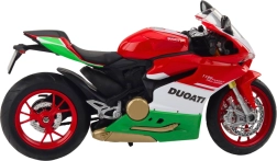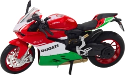 Метален модел с тритонален дизайн (червено, бяло, зелено), вдъхновен от италиански състезателни мотоциклети, впечатлява с автентичност.