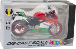 Прецизно изработеният метален модел на спортен мотоциклет е идеален избор за колекционери, фенове на моторните спортове и деца, които обичат динамични превозни средства. С подвижен кормилен лост, окачване и въртящи се колела този модел предлага автентично усещане при каране и маневриране. С неговия червено-бяло-зелен дизайн, вдъхновен от италиански състезателни мотоциклети, е подходящ не само като играчка, но и като стилна декорация.
