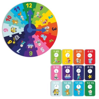 Цветен образователен пъзел във формата на часовник за деца от 3 години, вдъхновен от сериала COCOMELON. Помага за развитие на фината моторика, разпознаването на форми и цветове и запознава децата с основите на измерването на времето по забавен начин.