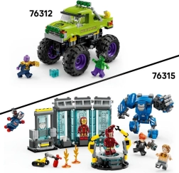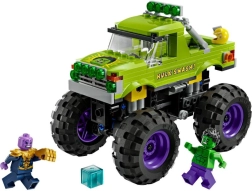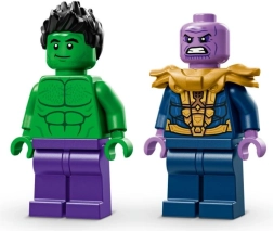 Постройте геройски monster truck, който се справя с всяка мисия. Кабината с отваряне побира минифигурката на Хълк, огромните колела и окачването поемат всеки терен, а надписът Hulk Smash! придава неповторим стил. Не липсва и впечатляващият Танос с Ръкавицата на безкрайността и Тесеракта за епични сблъсъци между доброто и злото.