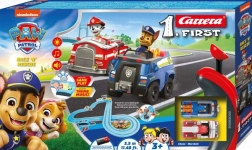 Състезателно забавление за най-малките! Пистата CARRERA FIRST с лиценз на Paw Patrol (Пес Патрул) предлага трасе с дължина 3,5 m с интерактивни светлини и звуци, две колички (Чейс и Маршал) и контролери за скорост. Благодарение на лесното сглобяване, магнитите и контактните четчици колите се държат отлично на трасето. Идеална писта на батерии за деца от 3 години.