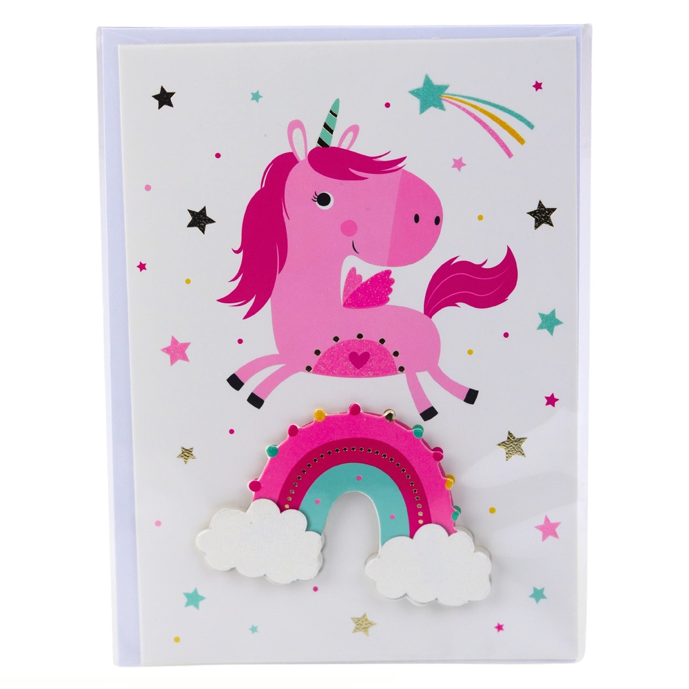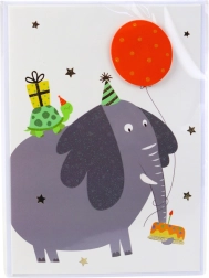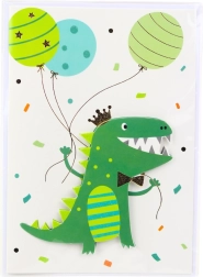Веселите мотиви на еднорог, динозавър, слон и жаба придават на картичката игрив и радостен характер.