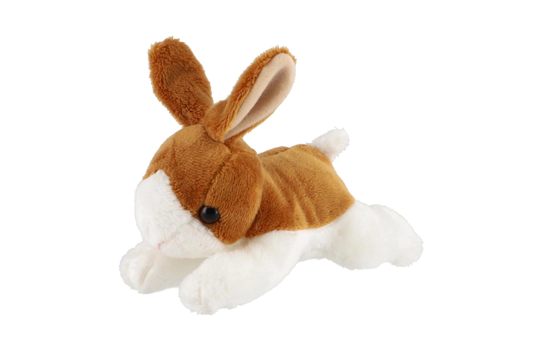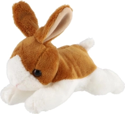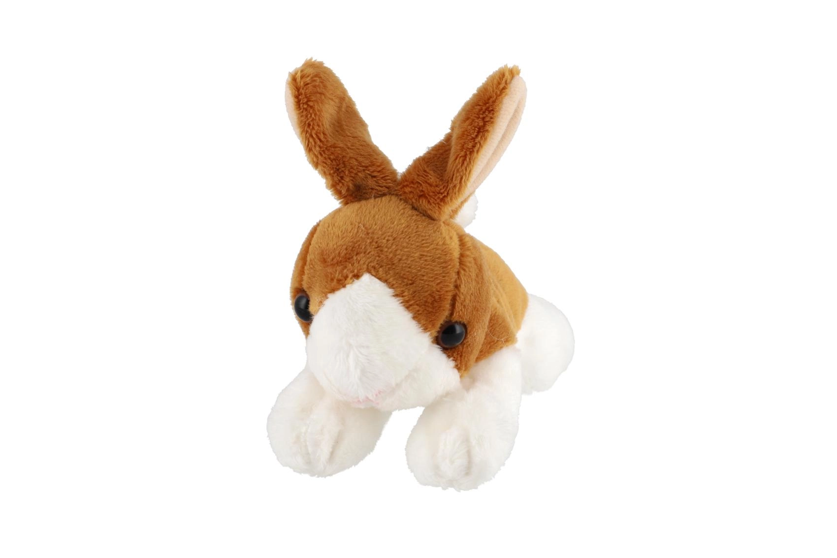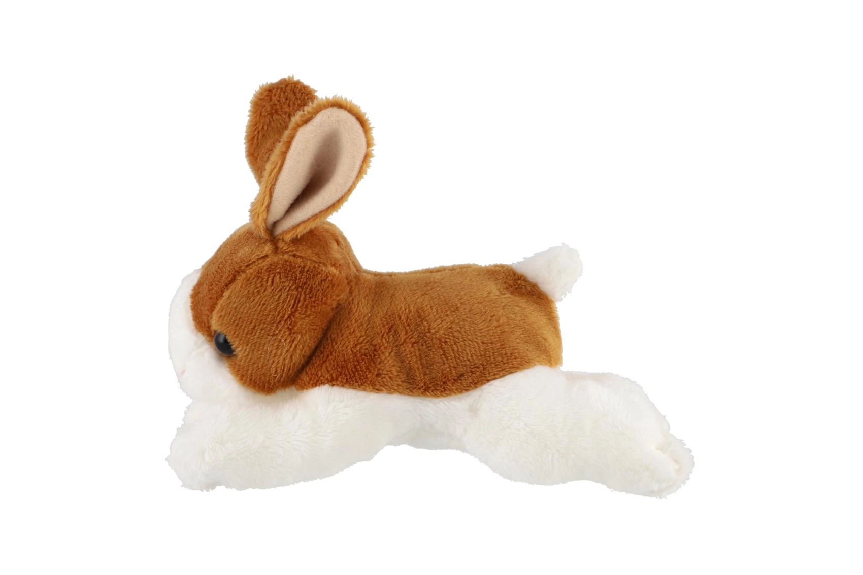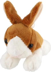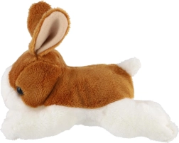 Очарователното кафяво-бяло плюшено зайче в легнала позиция радва децата от раждането. То е изключително меко, безопасно за бебета и благодарение на компактния размер се държи отлично в малките ръчички. Идеално за гушкане, успокояване и фантазийна игра.