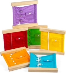 Комплектът от шест монтесори рамки на Bigjigs Toys помага на децата от 3 години да тренират самообслужване и фината моторика. Всяка дървена рамка предлага различно закопчаване – цип, копчета, връзки, катарами, тик-так копчета и велкро. Изработено от FSC сертифицирано дърво, безопасни нетоксични бои, отговаря на европейските стандарти.