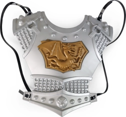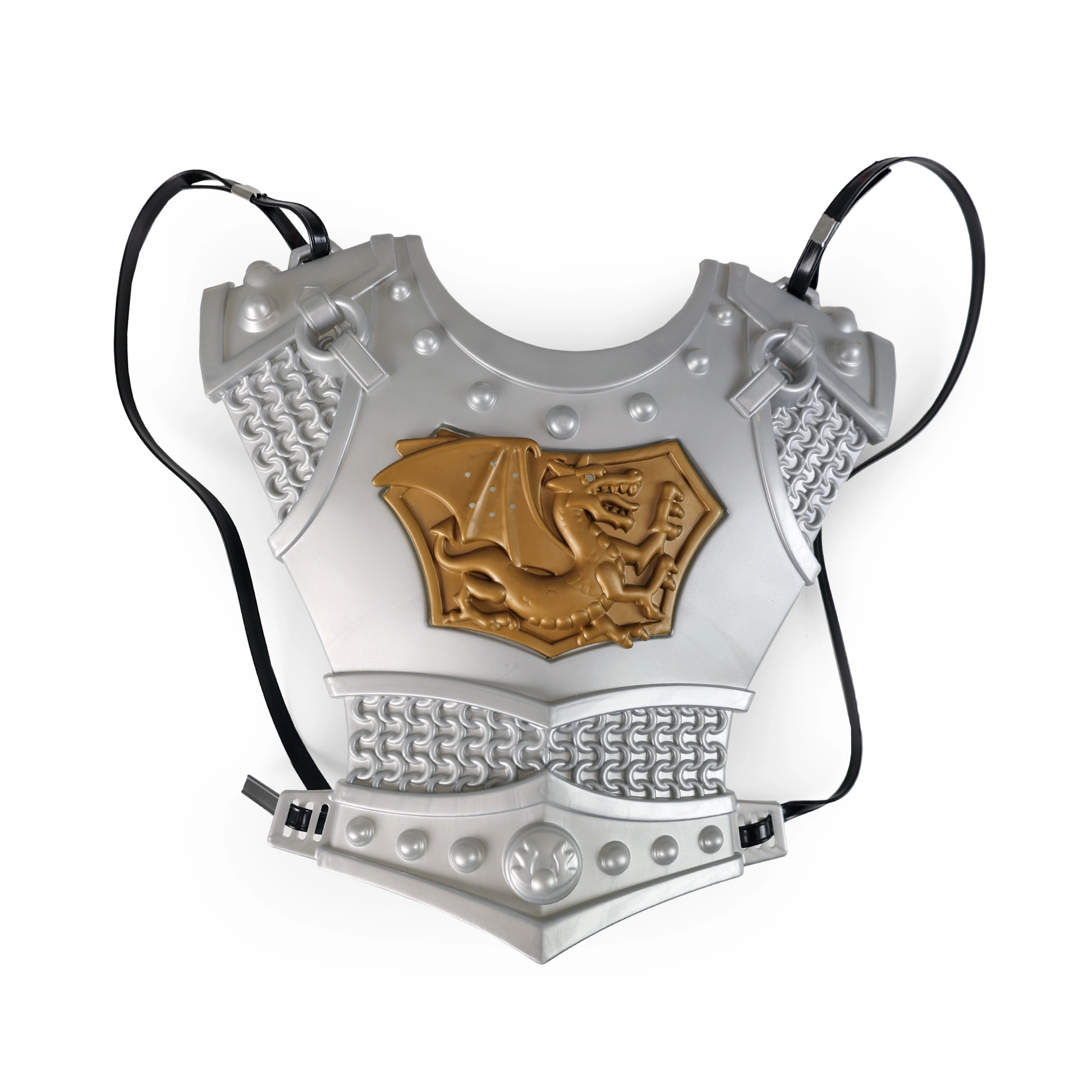 Шлем, броня, меч и щит образуват цялостен сет, с който детето е готово за всяко приключение – от карнавал до домашни битки.