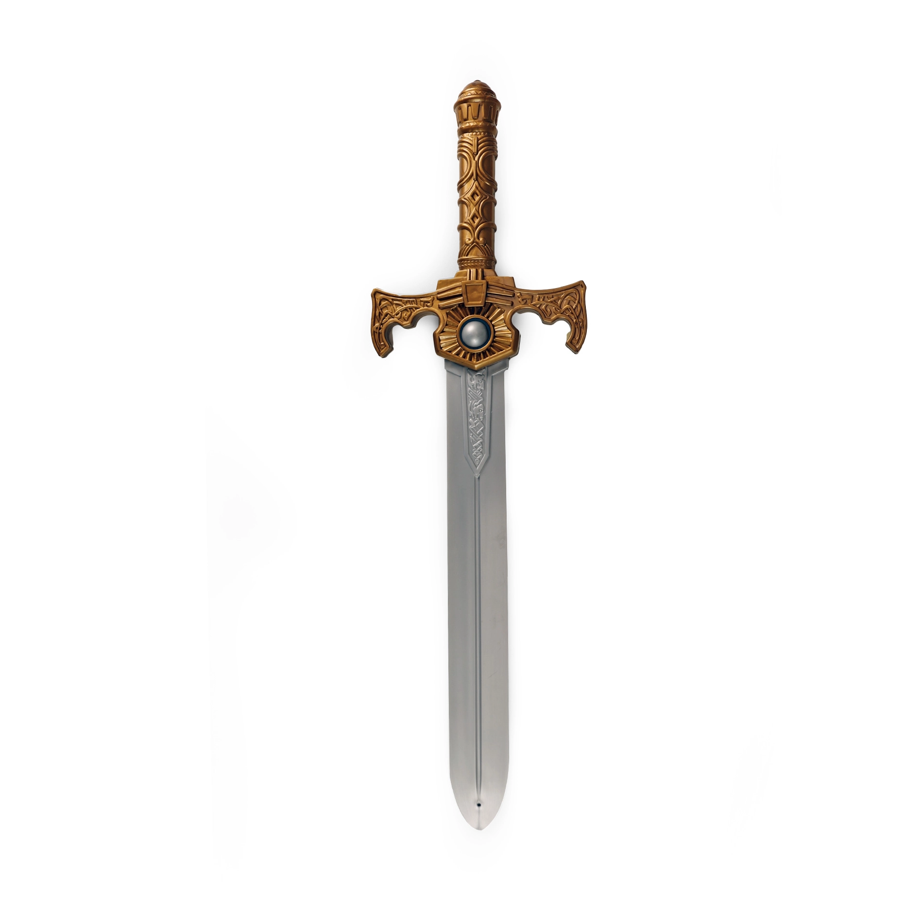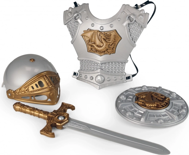 Този голям рицарски комплект превръща всяко дете в смел защитник на кралството. Леката конструкция и издръжливото пластмасово изпълнение осигуряват лесно носене и безопасна игра. Реалистични детайли, като златния дракон върху щита и бронята, придават на всяка битка средновековно очарование.