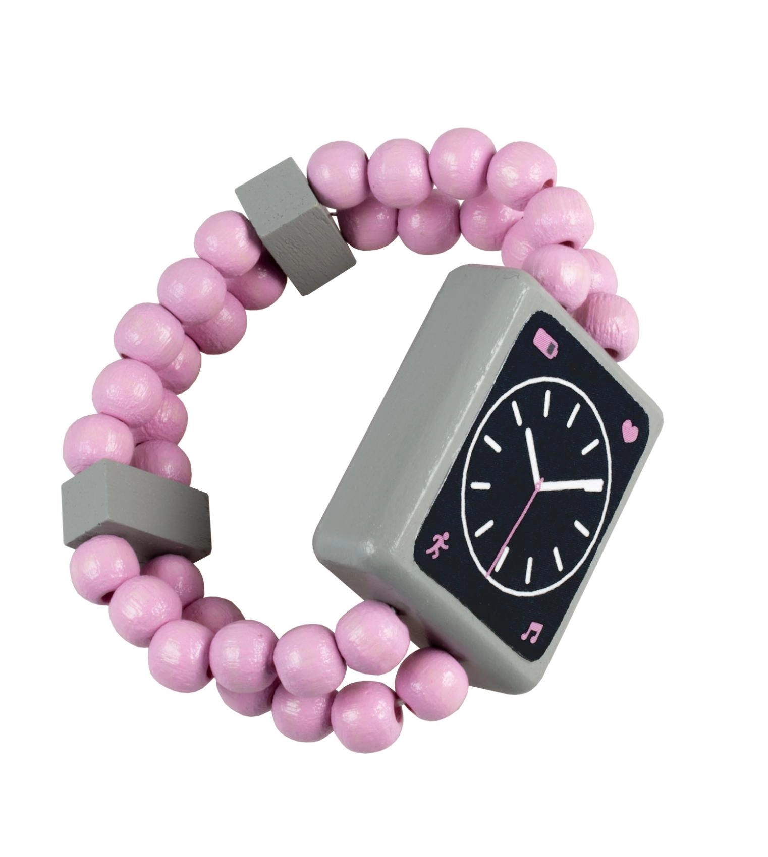 Еластичната гривна от гладки дървени мъниста се напасва удобно към детската ръчичка. Качествените материали и прецизната изработка осигуряват безопасна и издръжлива ежедневна игра. Децата също ще се забавляват с престорена игра на смарт часовник.