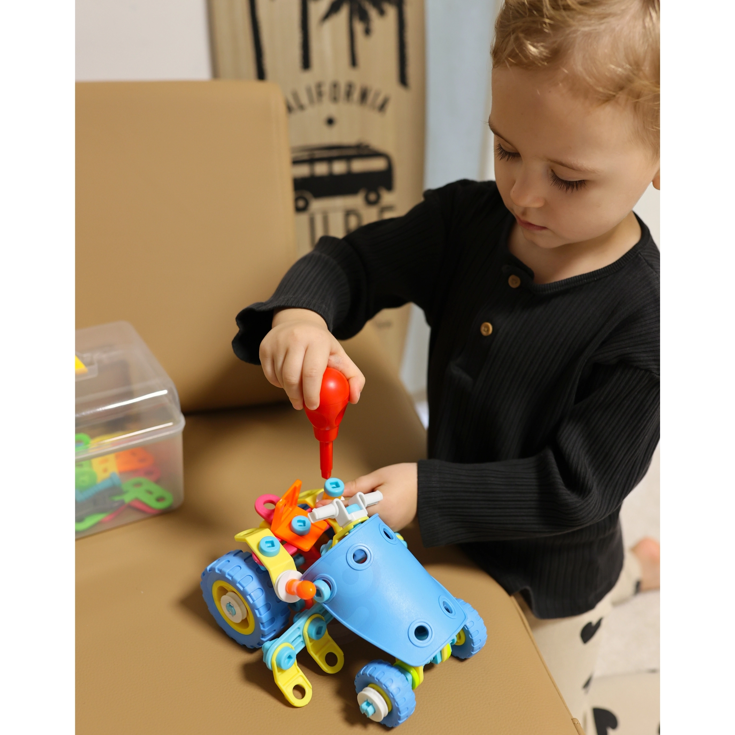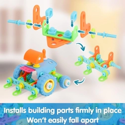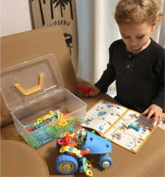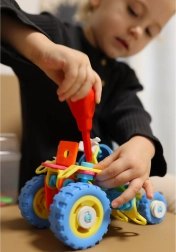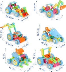 Конструкторът WOOPIE 6в1 STEM е идеален избор за малки конструктори от 5 години. Гъвкавите елементи, колелата и подвижните части позволяват на децата да сглобяват различни функционални модели на превозни средства – от товарач до трактор с плуг. Практичните отвертка и ключ в комплекта подпомагат развитието на мануалните умения и координацията.