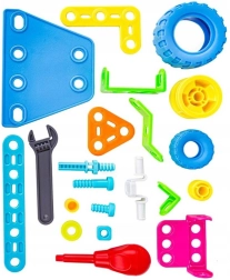 - 118 части: елементи с различна форма, колела, винтове и гайки, отвертка и плосък ключ