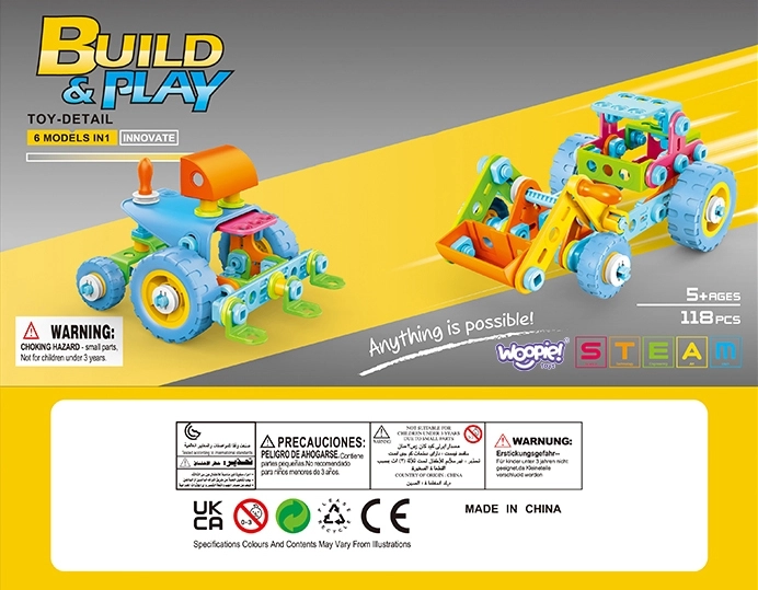 Открийте креативния конструктор на превозни средства 6в1 от марката WOOPIE, който носи на децата часове умно забавление. От 118 части сглобяват багер, трактор, кола или кран, като развиват фината моторика, логическото мислене и пространственото въображение. Интуитивната система със завиване, безопасните материали и илюстрираното ръководство осигуряват лесен монтаж и много радост от творенето.