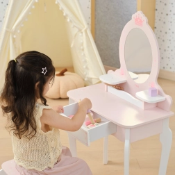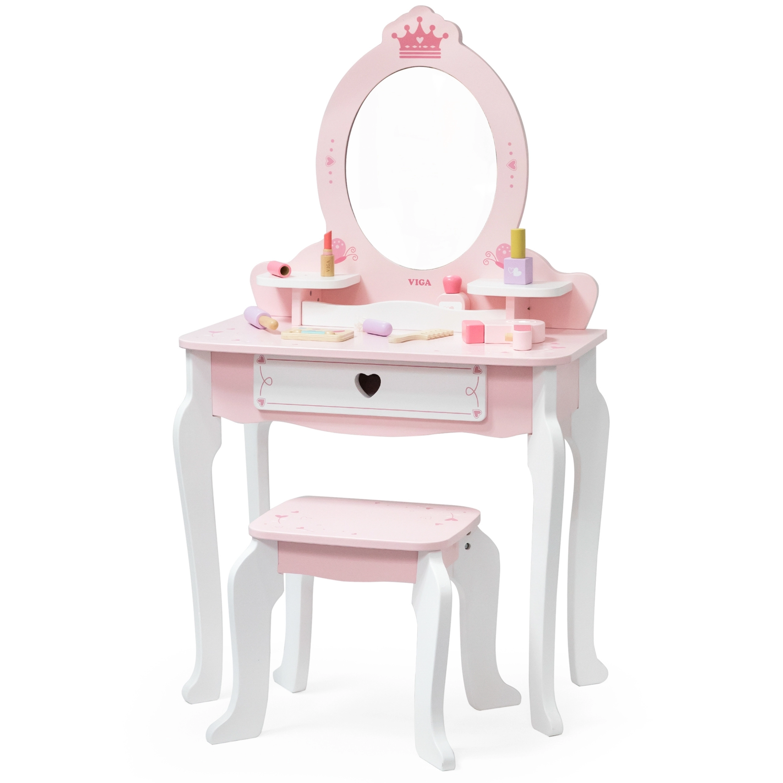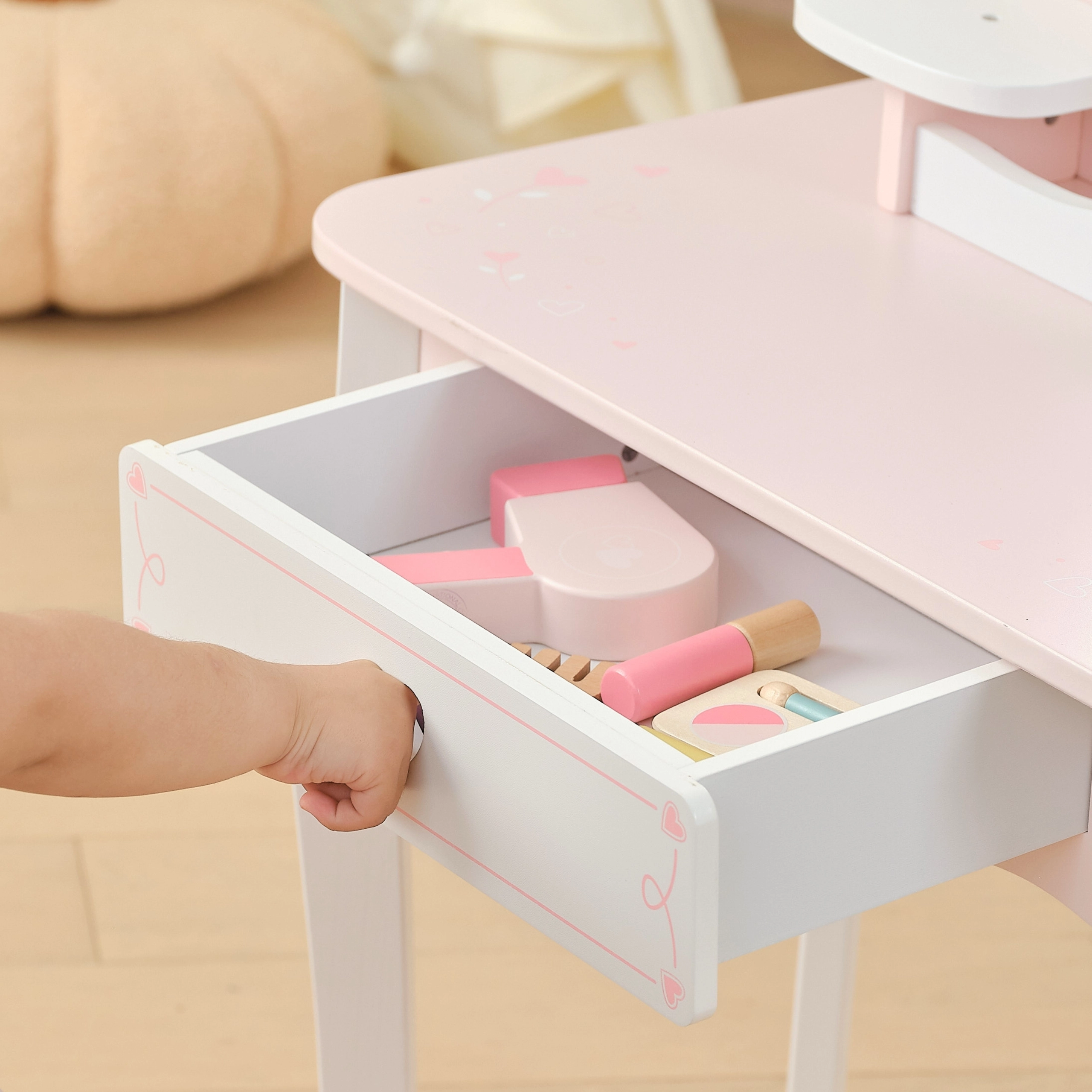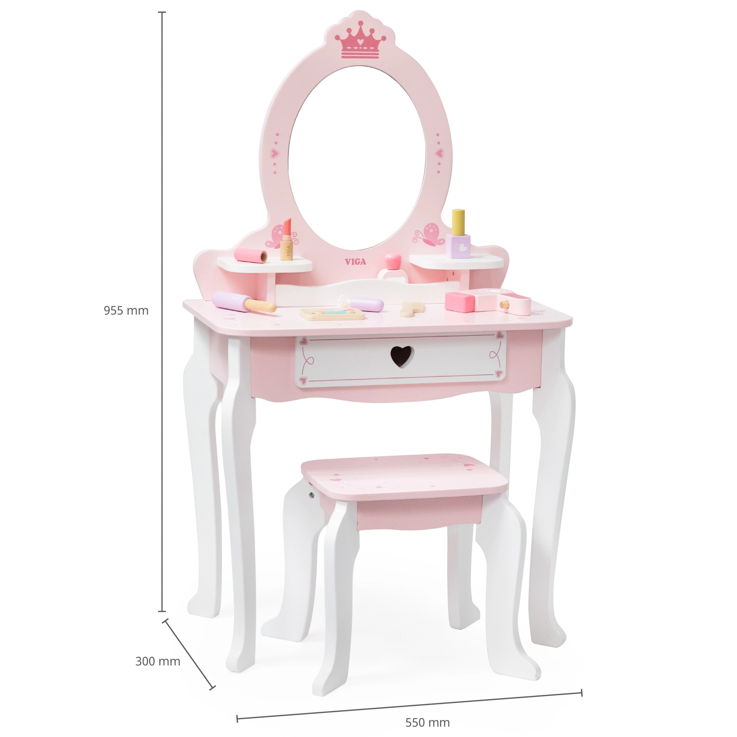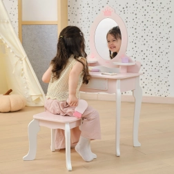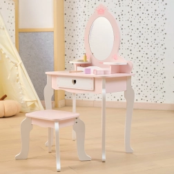 Тази розово‑бяла тоалетка от качествено дърво предлага на децата безопасно място за въображаемо гримиране и сресване. Овалното огледало с мотив корона, сладките детайли със сърчица и стабилното столче придават на стаята приказна атмосфера.