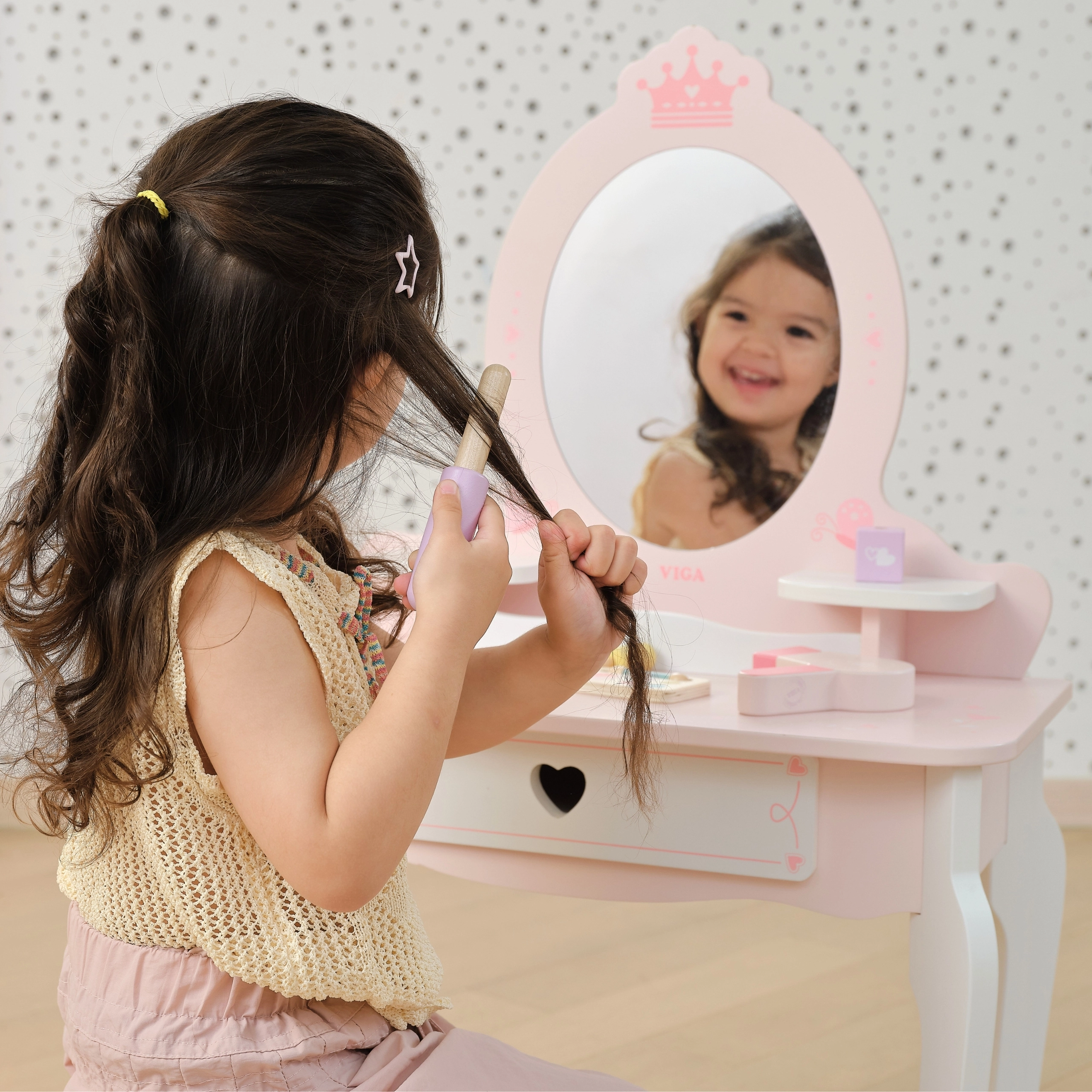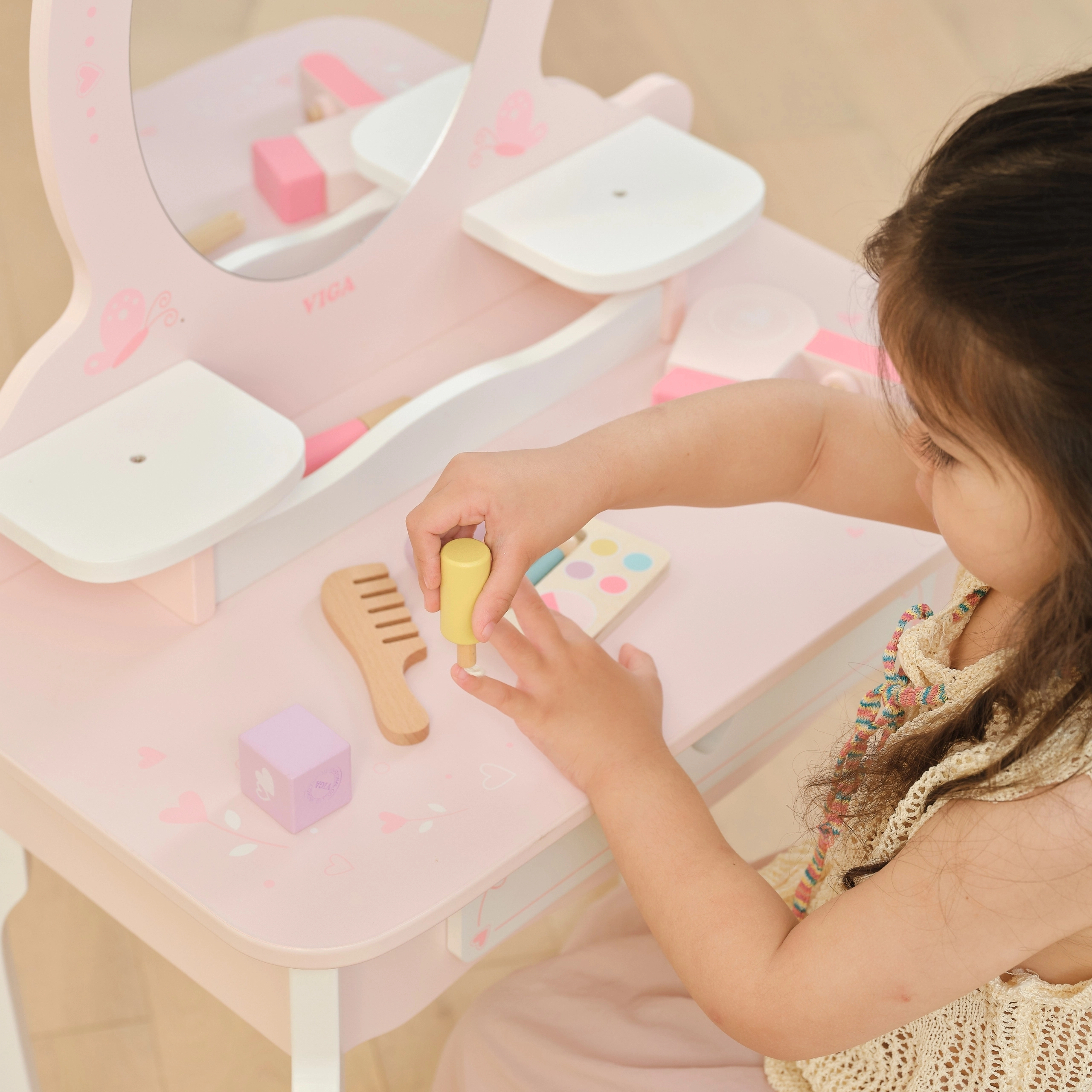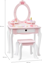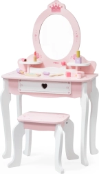 Практичното чекмедже и страничните полици побират всички съкровища. В комплекта има богат набор от дървени аксесоари: палитра с четчица, червило, лакове за нокти, парфюм, гребен, мека пудрена четка и сешоар. Играчката е с гладки ръбове и повърхност, обработена с нетоксични бои за безопасна игра.