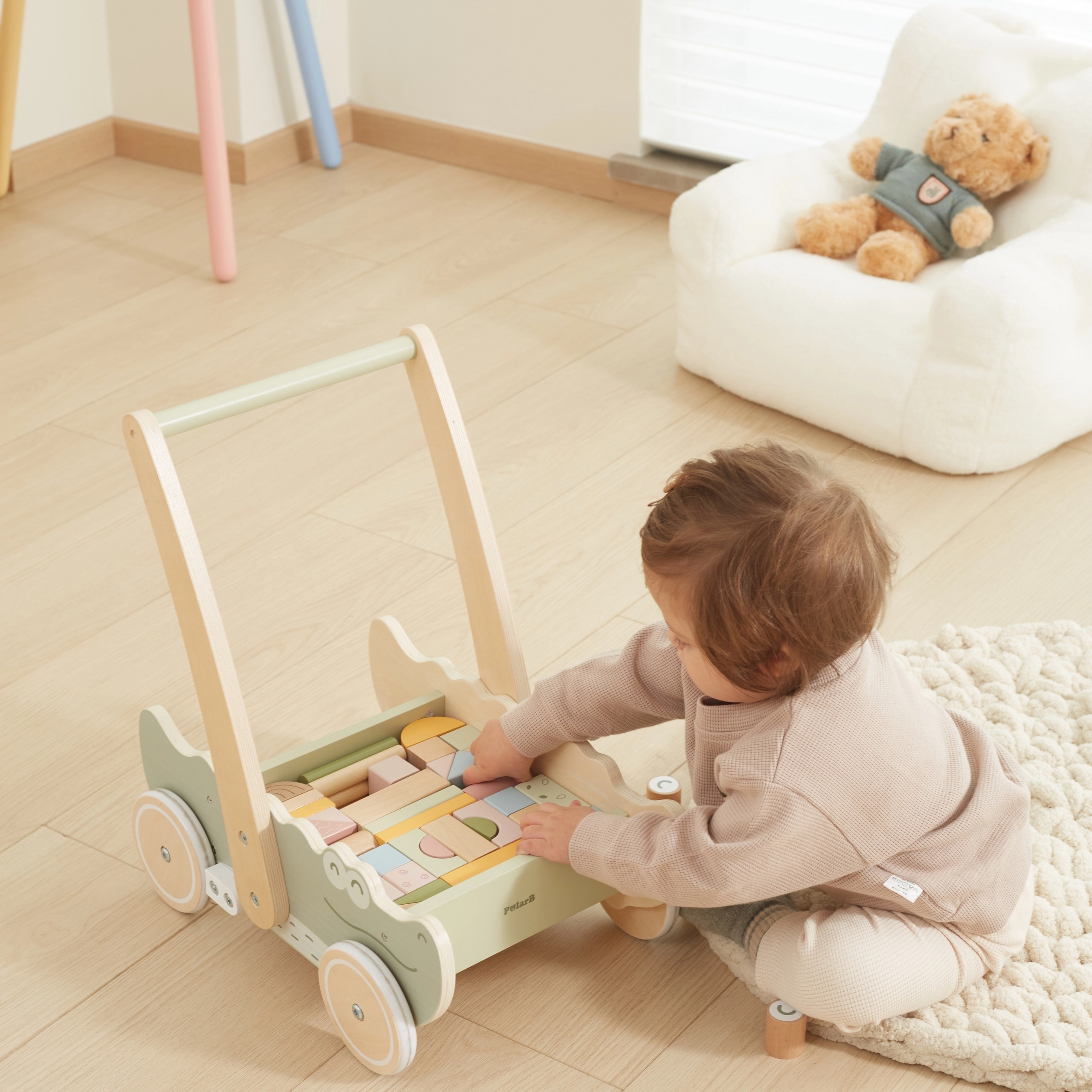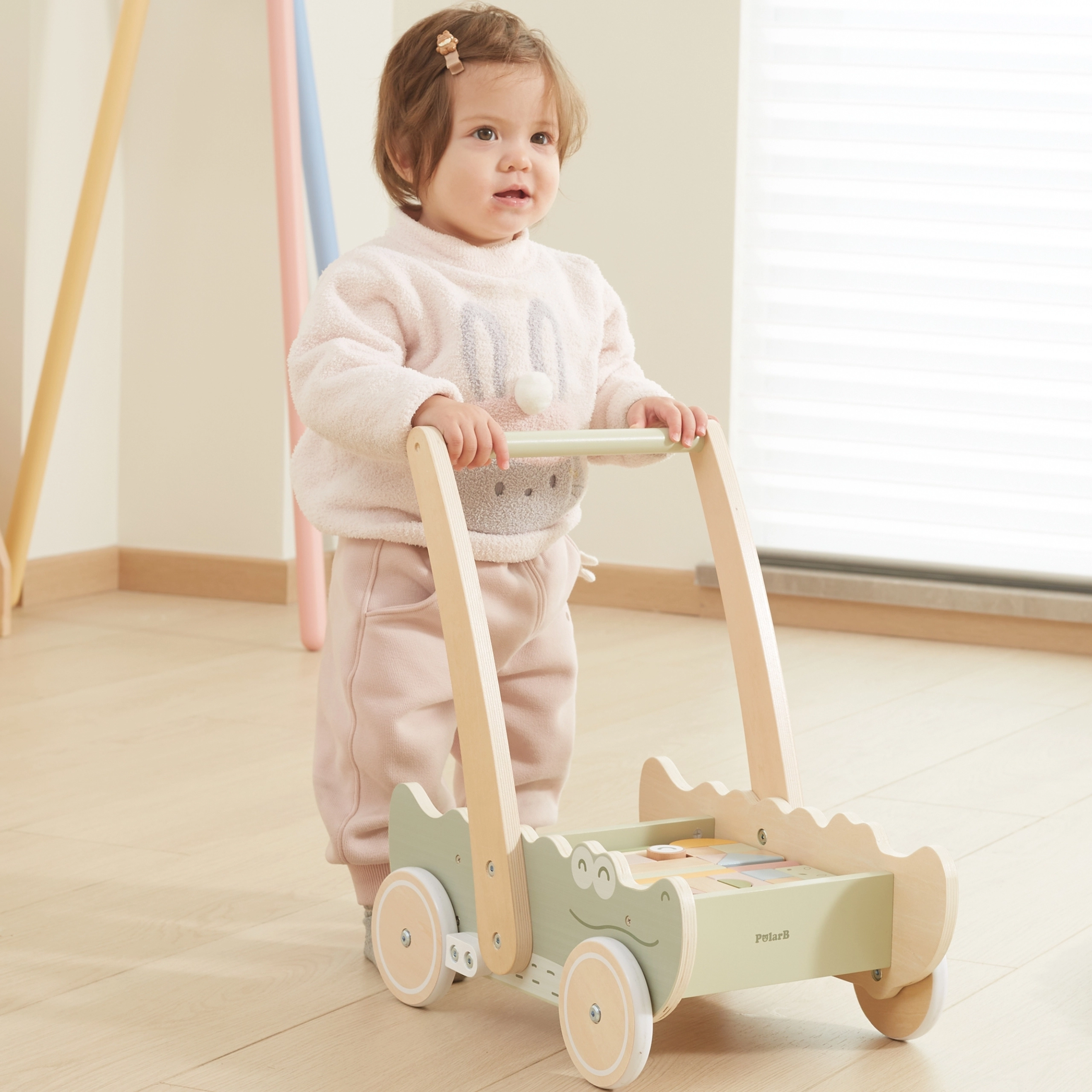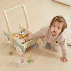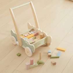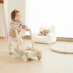 Дървената конструкция осигурява здрава опора за малките крачета, което позволява на детето безопасно да се учи да ходи.