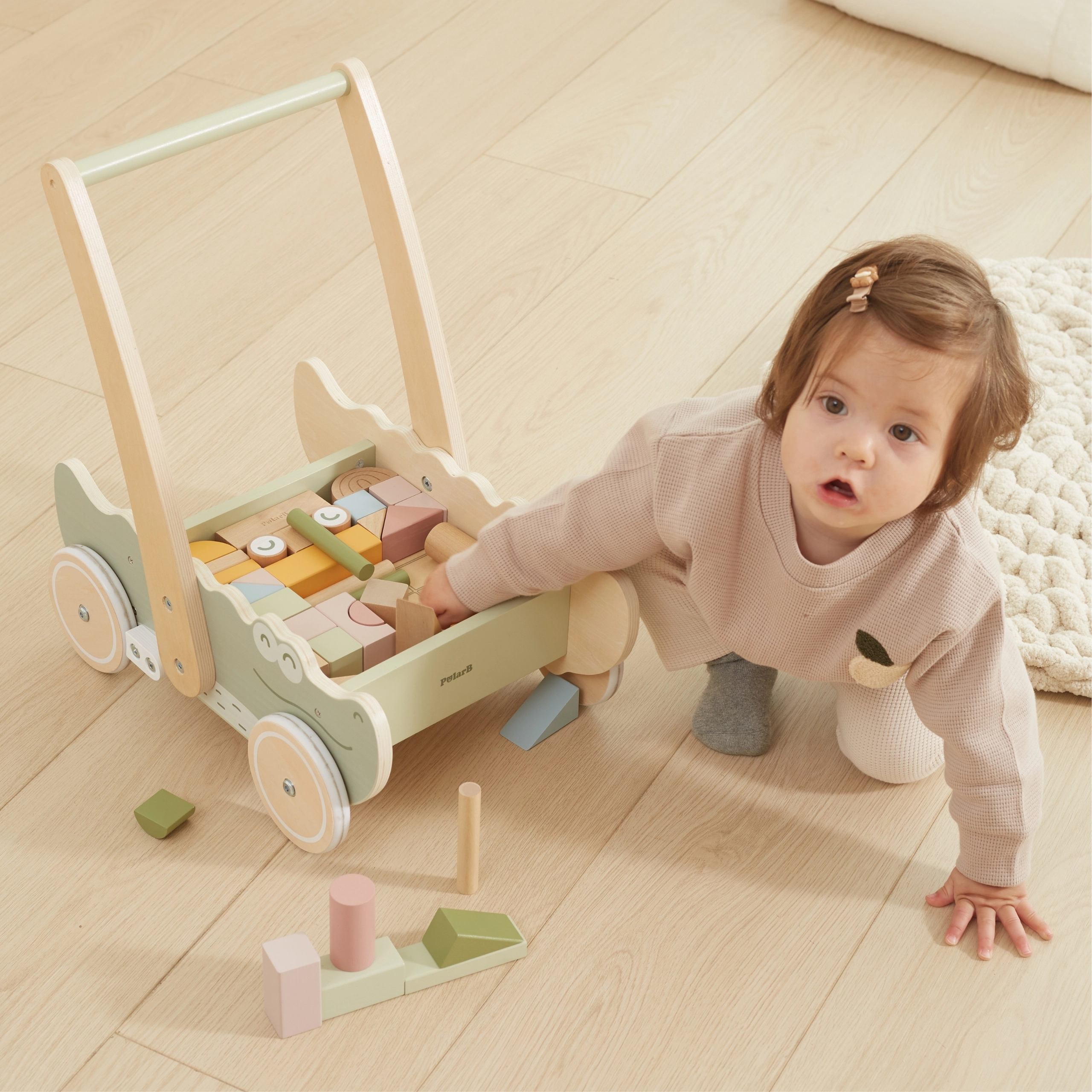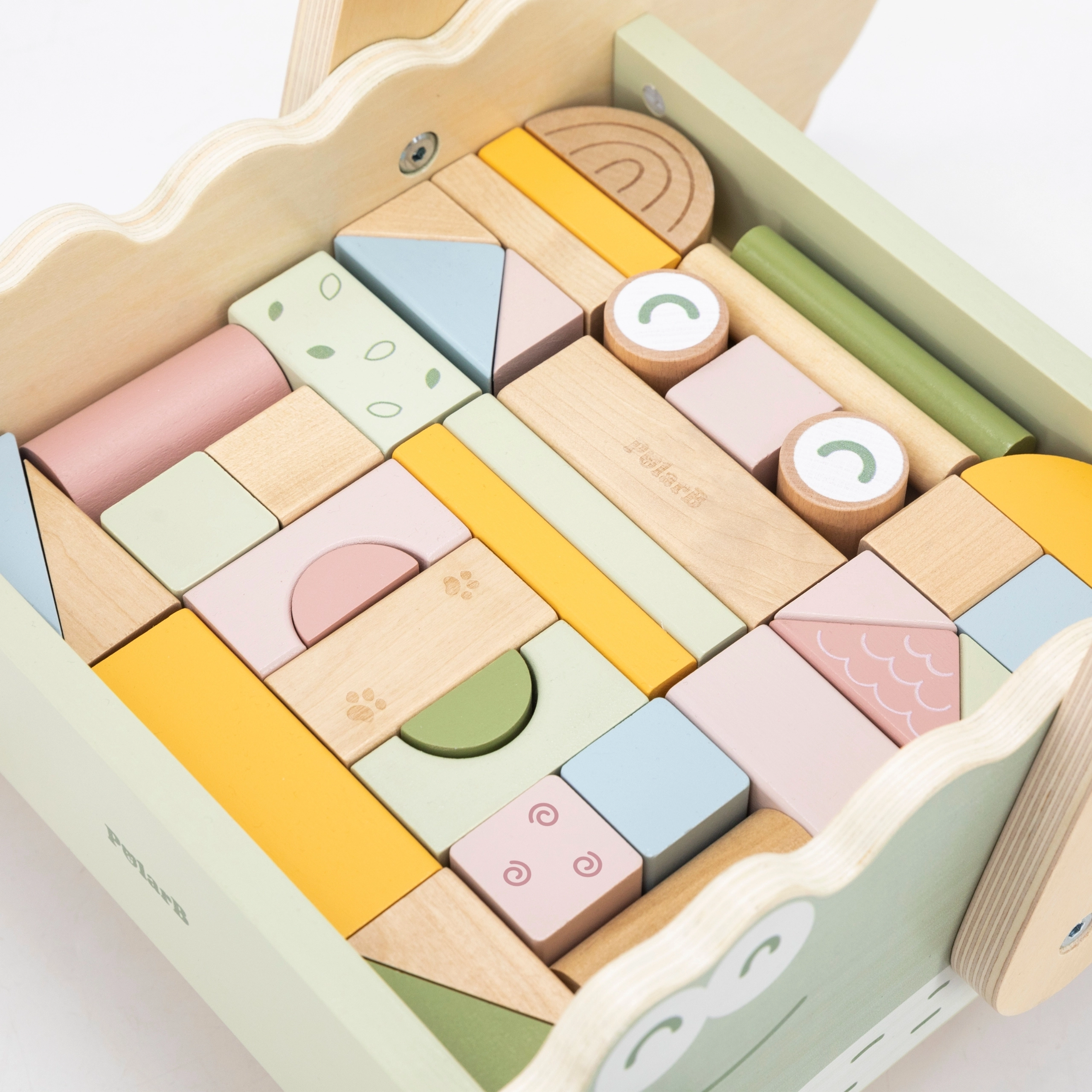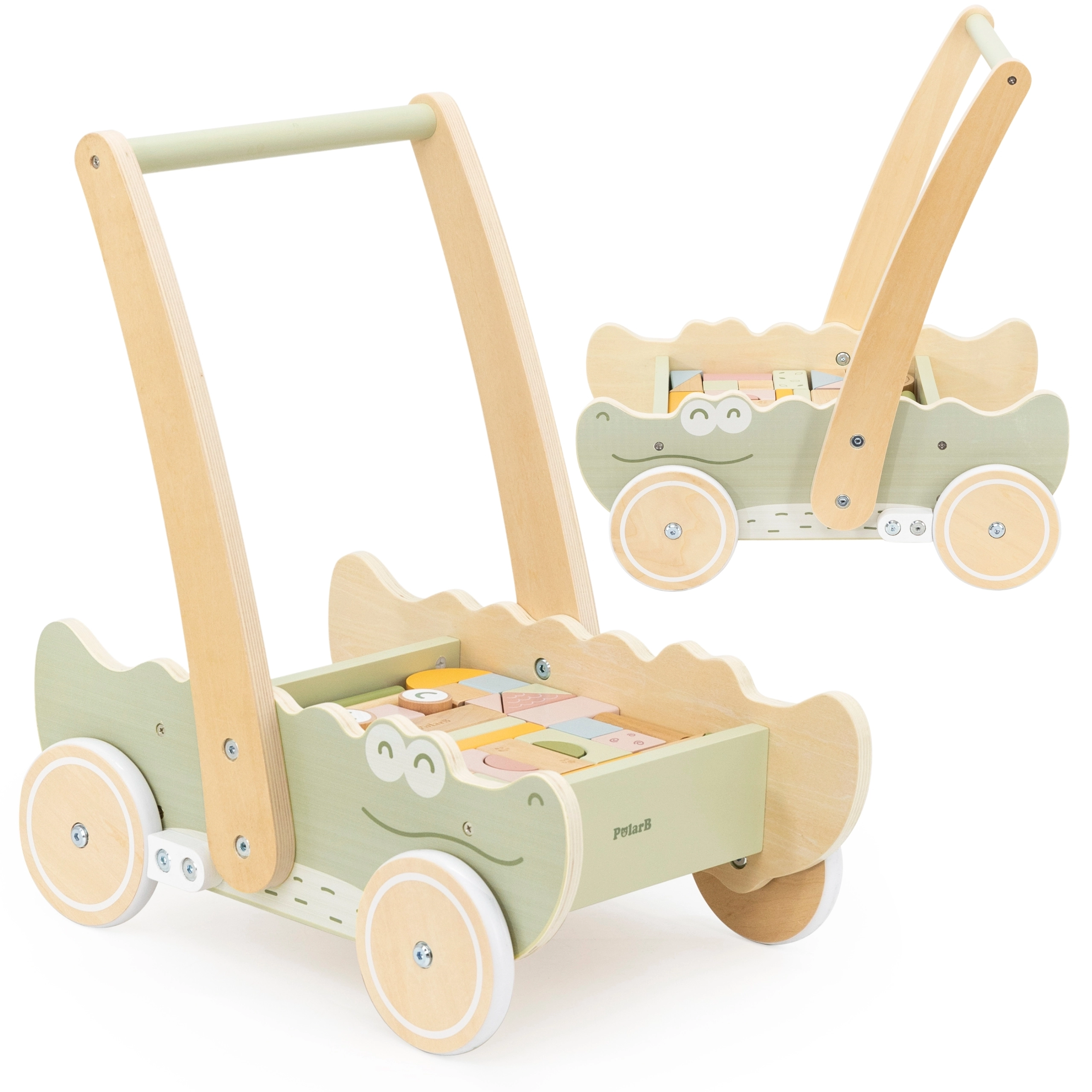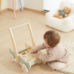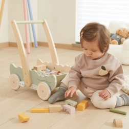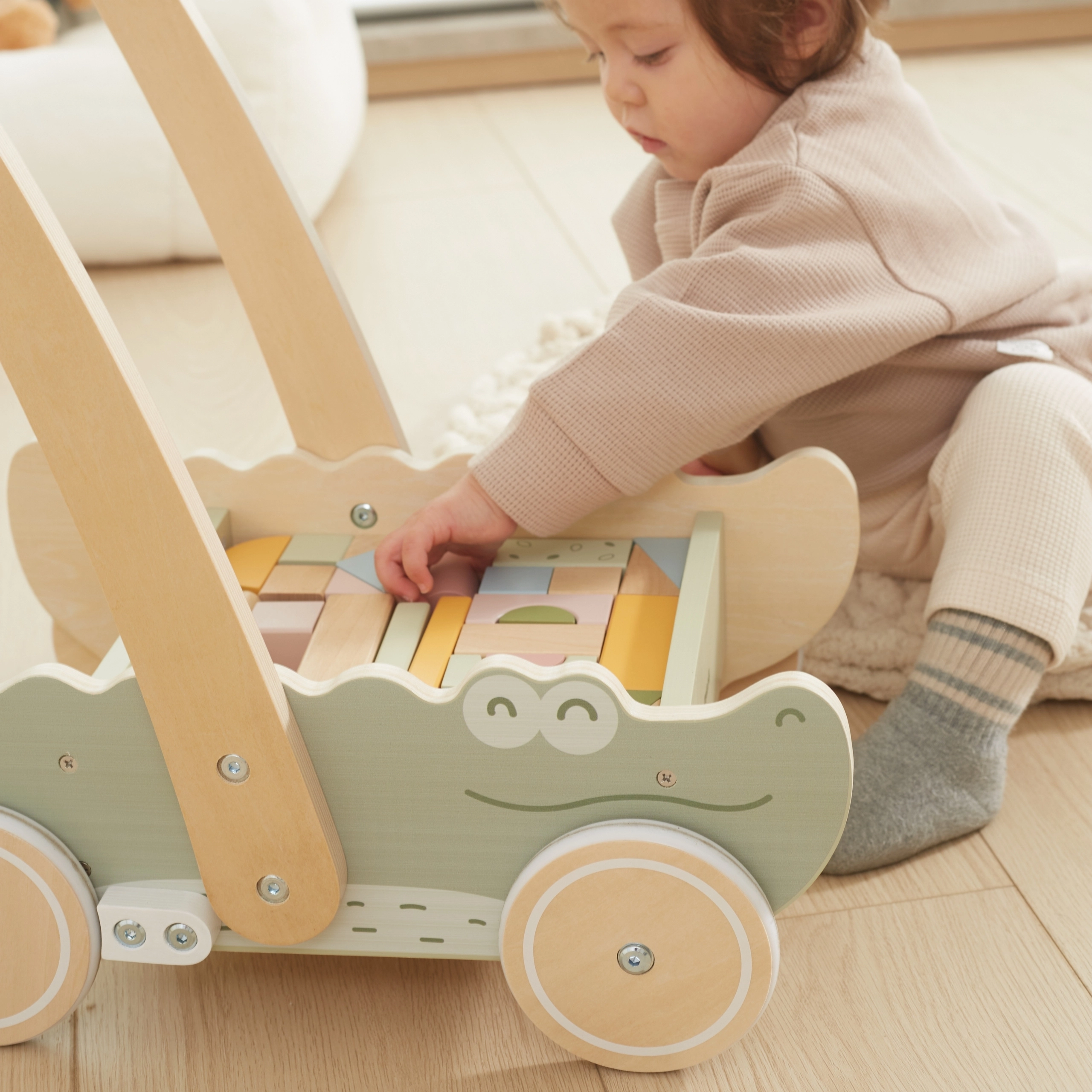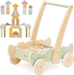 Цветните кубчета в различни форми и пастелни цветове не само насърчават игривото творчество, но и развиват фината моторика. Меките гумени колелца предпазват подовете и осигуряват плавно движение. Този крокодил с очарователен дизайн и меки цветове ще се превърне в любима играчка на всяко дете!