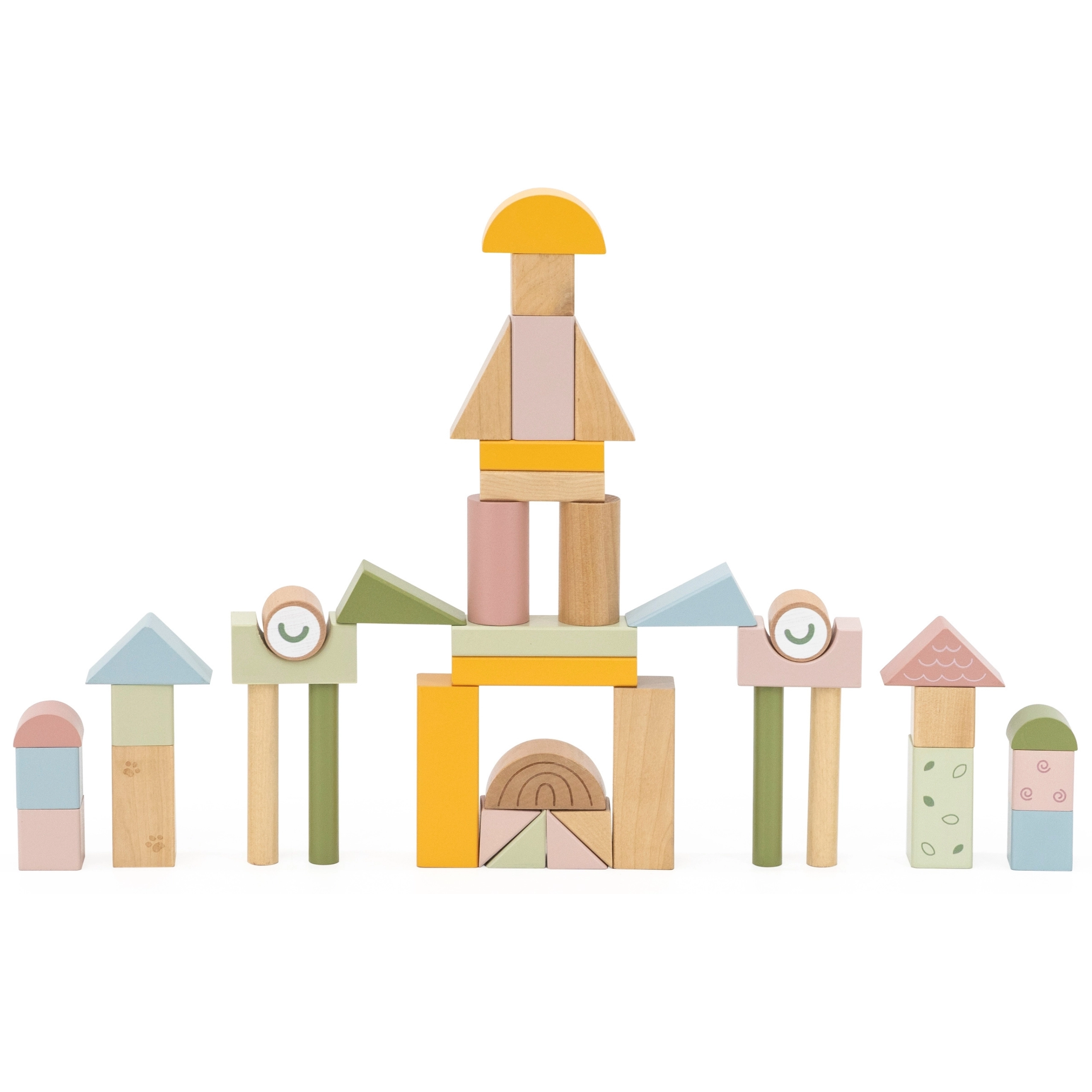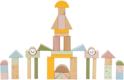 Различните форми и пастелни цветове на кубчетата насърчават креативността и ученето на цветове и форми.