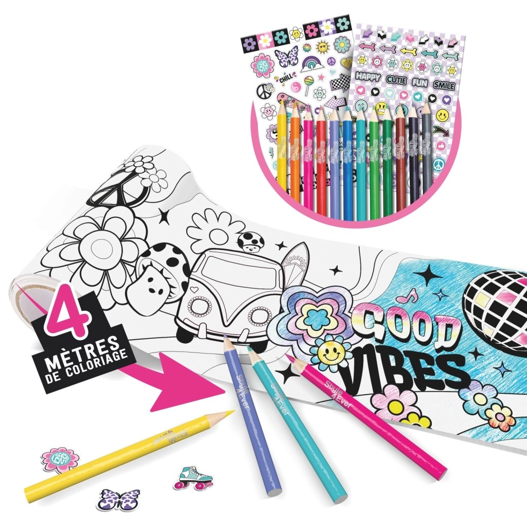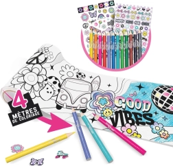 Открийте безкрайно забавление с комплекта Style4Ever оцветявки на ролка – 4 метра дълга ролка за оцветяване, 12 молива в ярки цветове и 50+ стикера за оригинално довършване. Идеален за деца от 6 години, развива фина моторика, креативност и концентрация – перфектно забавление за дълги часове.