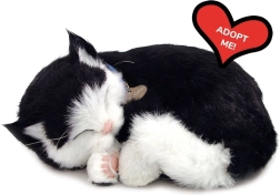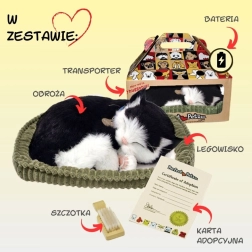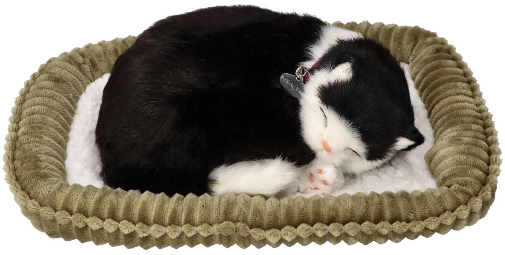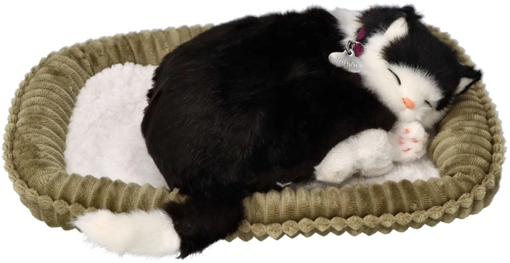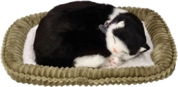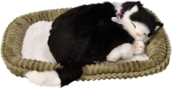 Това реалистично плюшено котенце в черно-бял вариант кротко спи в своето легълце и нежно „диша“, създавайки уютна атмосфера и усещане за присъствието на истински любимец. Благодарение на детайлната изработка, нашийника с етикет и меката козина е чудесен подарък за деца от 3 години и за любителите на котки.