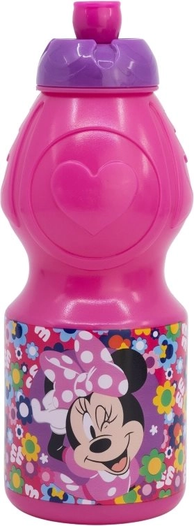 Розова пластмасова бутилка с лилава капачка и мотив на Minnie Mouse носи не само практичност, но и естетика за децата.